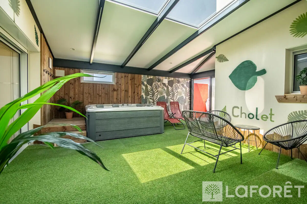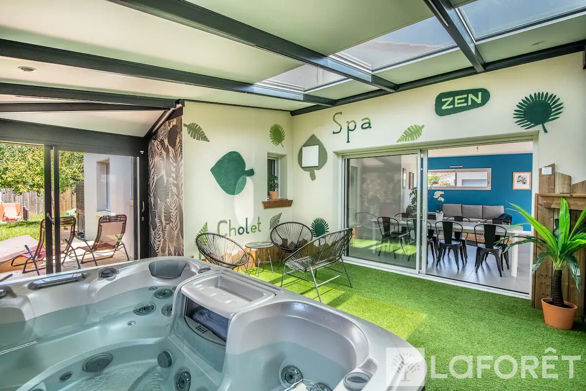 Cette maison offre un bel espace de vie avec un séjour-salon lumineux, une cuisine équipée avec arrière-cuisine, ainsi qu'une véranda avec SPA.