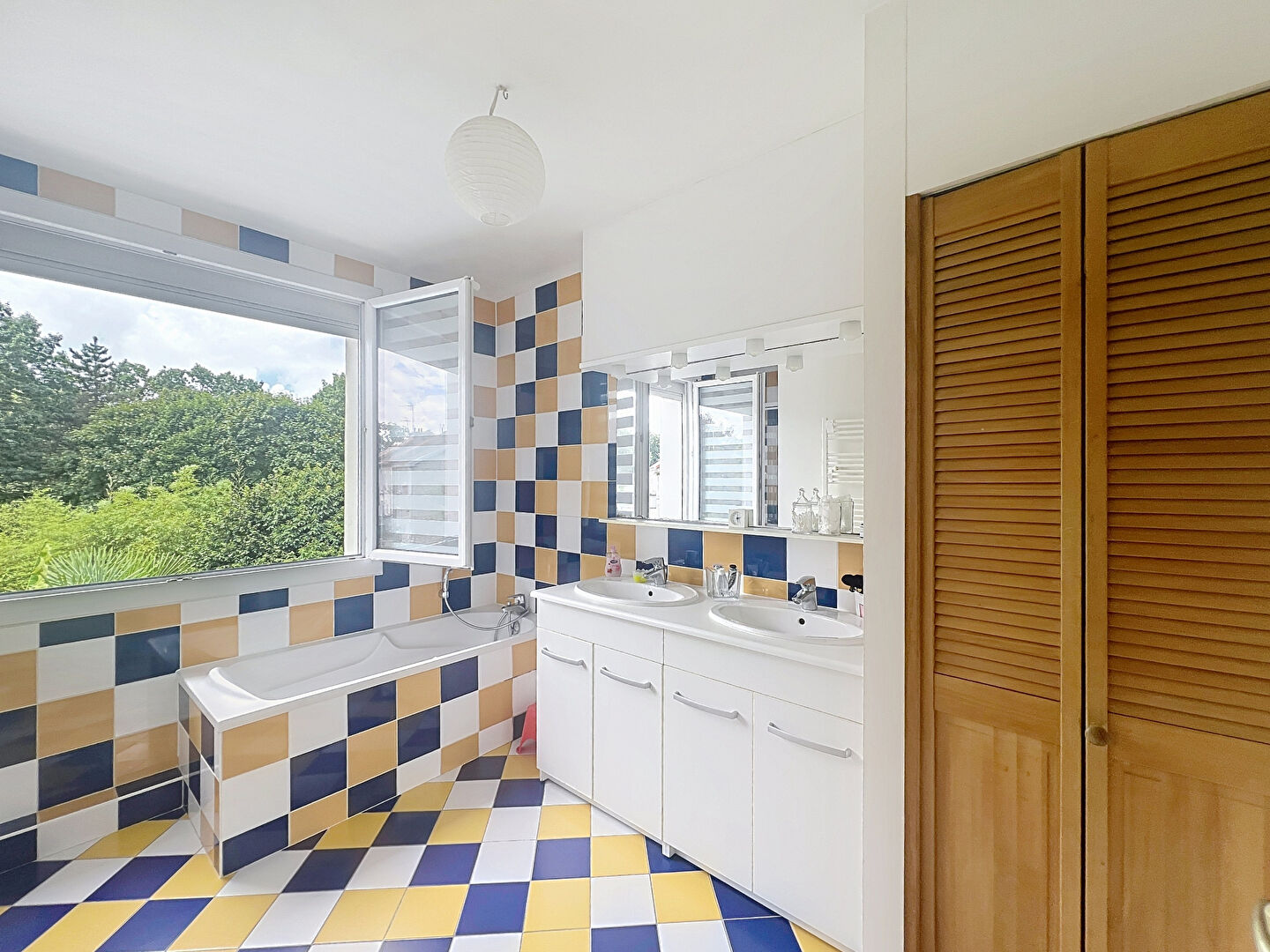 À l'extérieur, un grand jardin arboré.