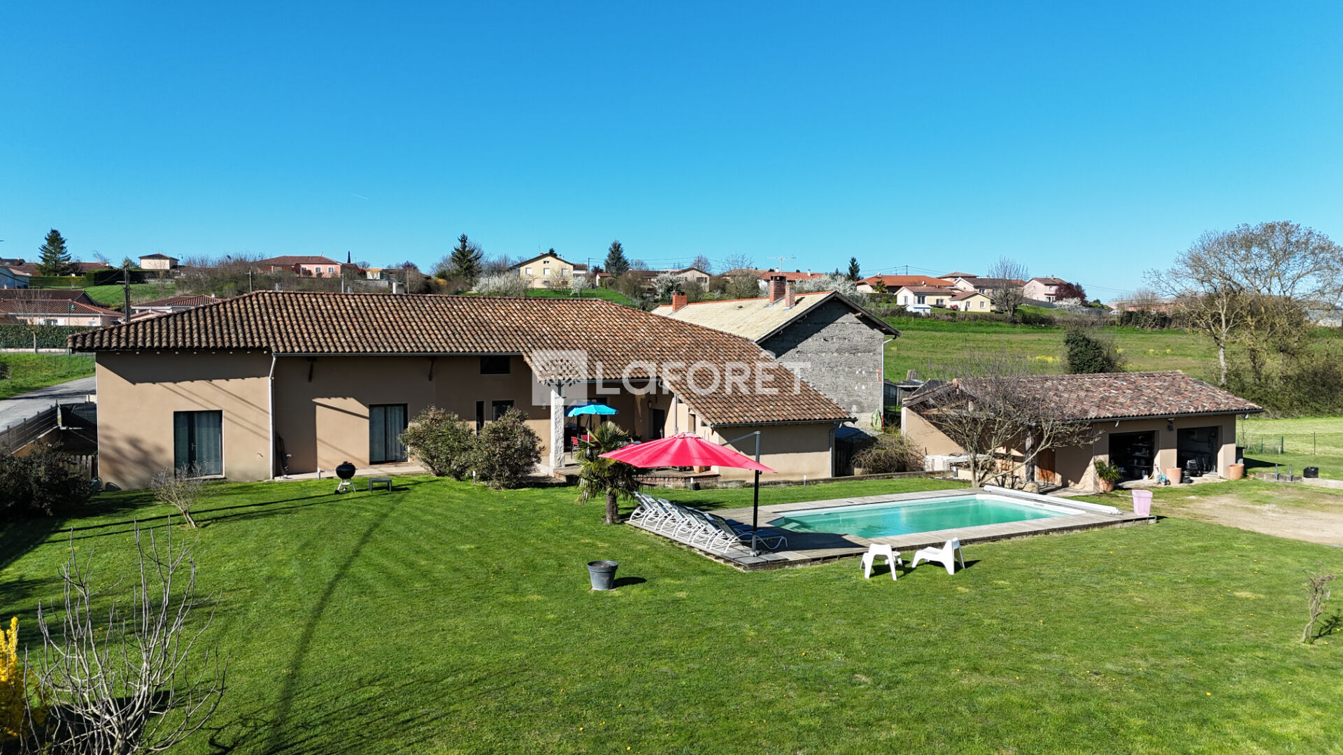 À l'extérieur, vous profiterez d'un environnement privilégié avec une piscine creusée et chauffée, un double garage et de nombreux espaces de détente. Le tout est implanté sur une belle parcelle au calme d'environ 5 800 m².