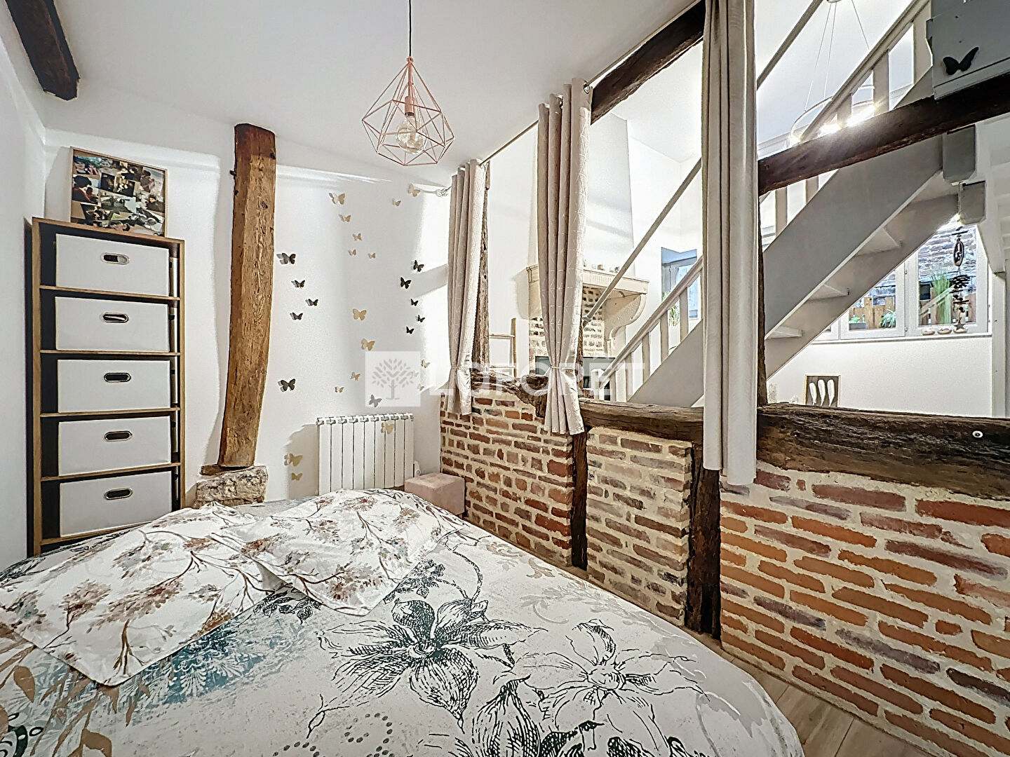 Il se compose d'une grande entrée ouvrant sur une cuisine équipée d'environ 20 m² accompagnée d'une buanderie/cellier, salle de bains avec WC, une chambre ouvrant sur le salon/séjour. Une mezzanine vient compléter l'appartement grâce aux belles hauteurs de la pièce de vie.
