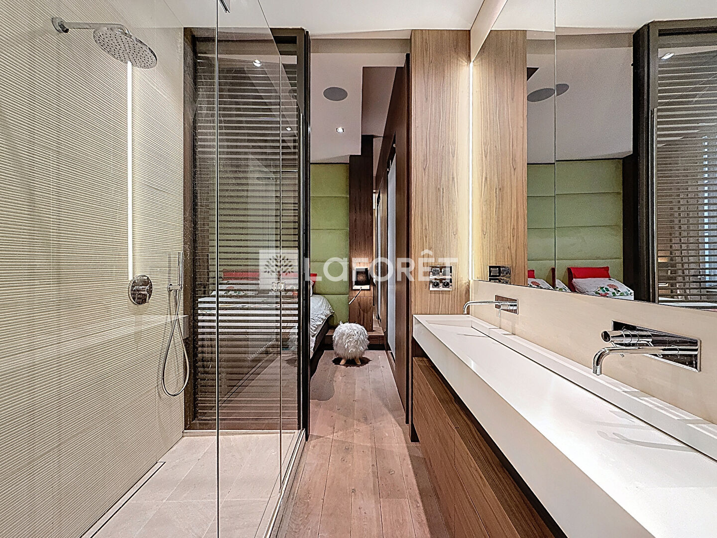 Vous y trouverez de nombreux rangements sur mesure, un espace bureau parfaitement intégré, et une grande suite composée de sa salle d'eau avec double vasque et de son dressing.