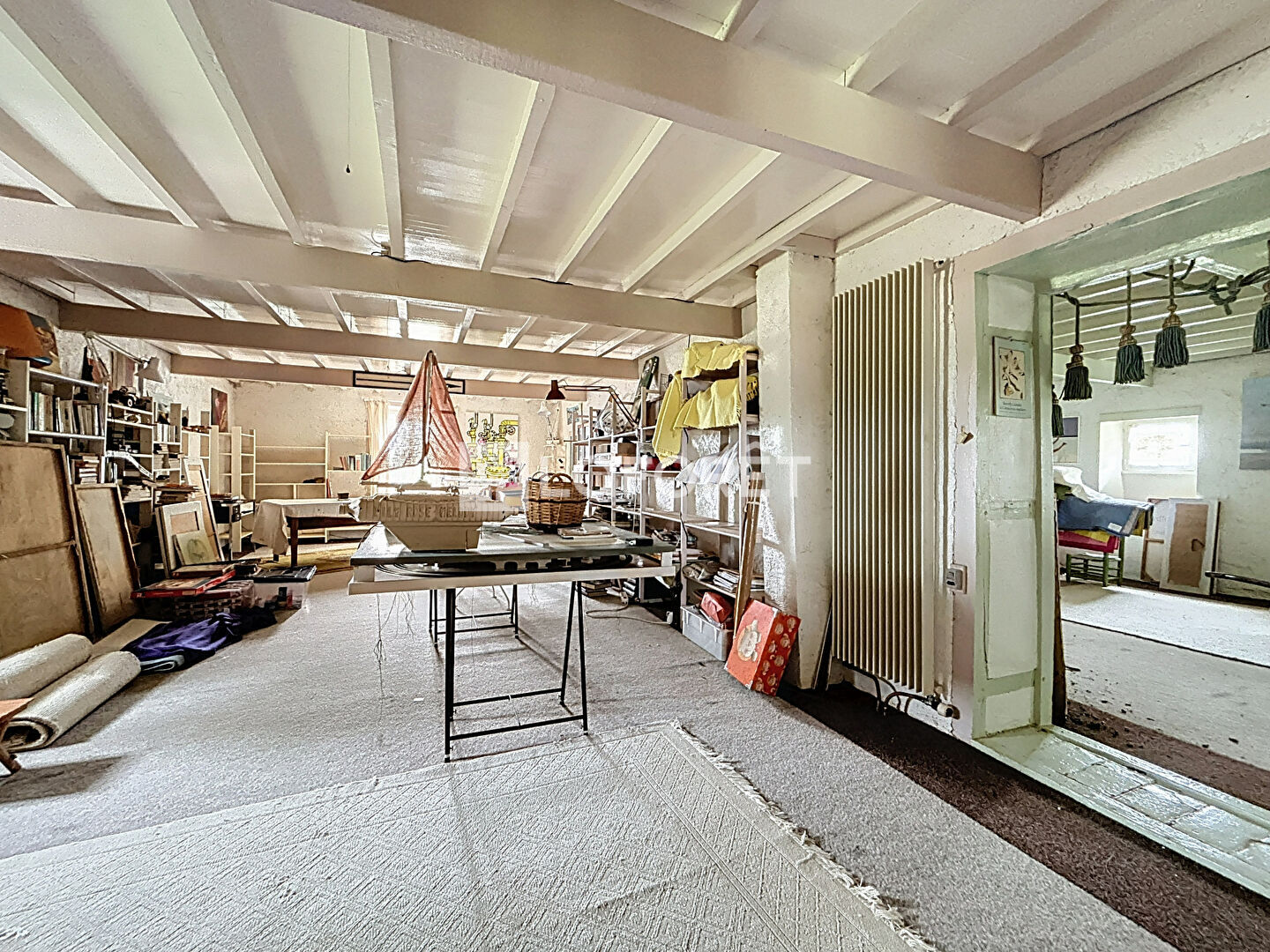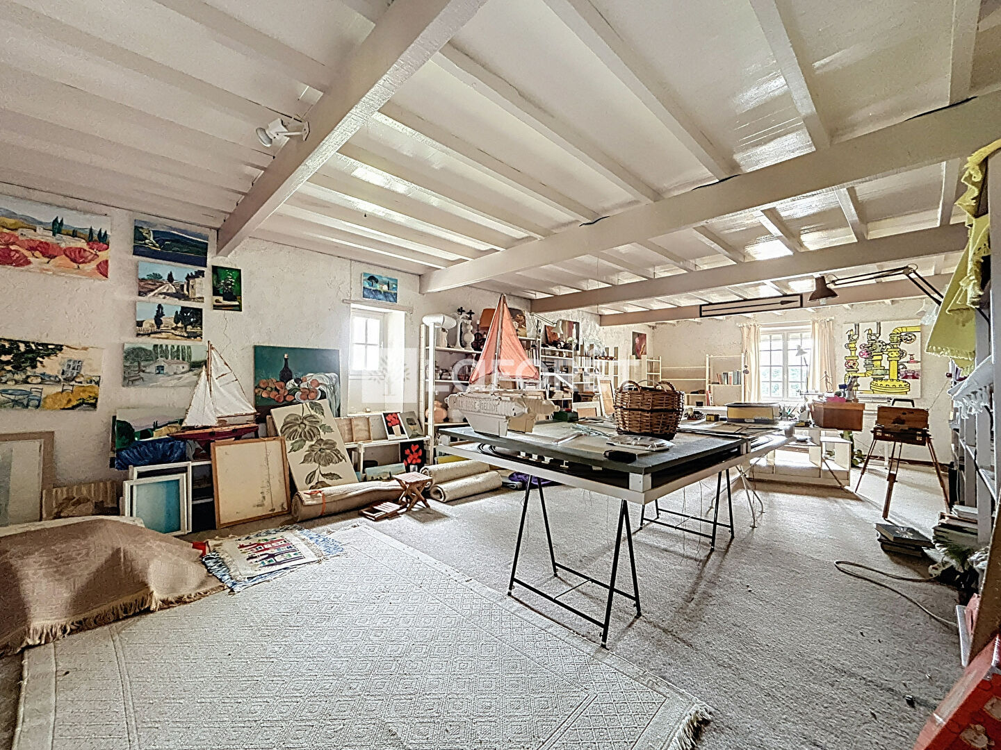 A l'étage, deux pièces de 60 m² chacune faisant actuellement office de bureau/atelier et pouvant très facilement se transformer en trois chambres supplémentaires + salle de bains grâce aux ouvertures existantes.