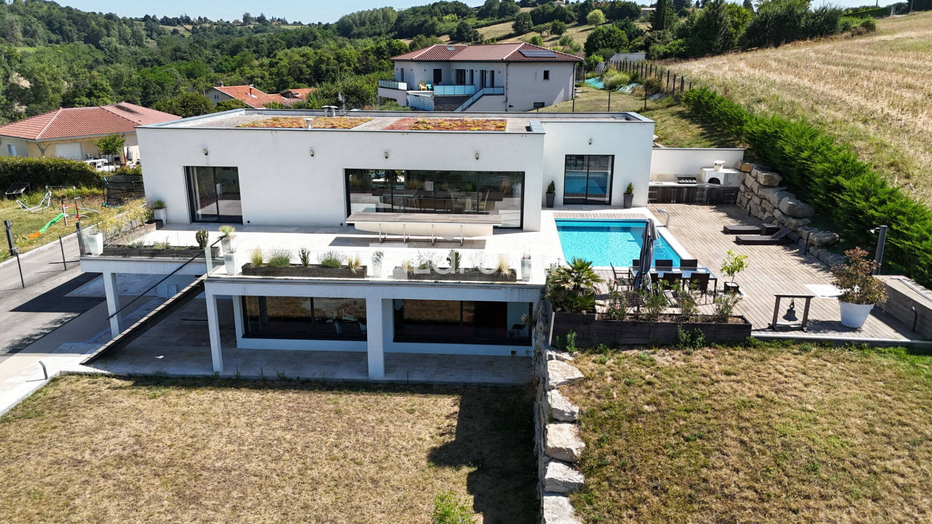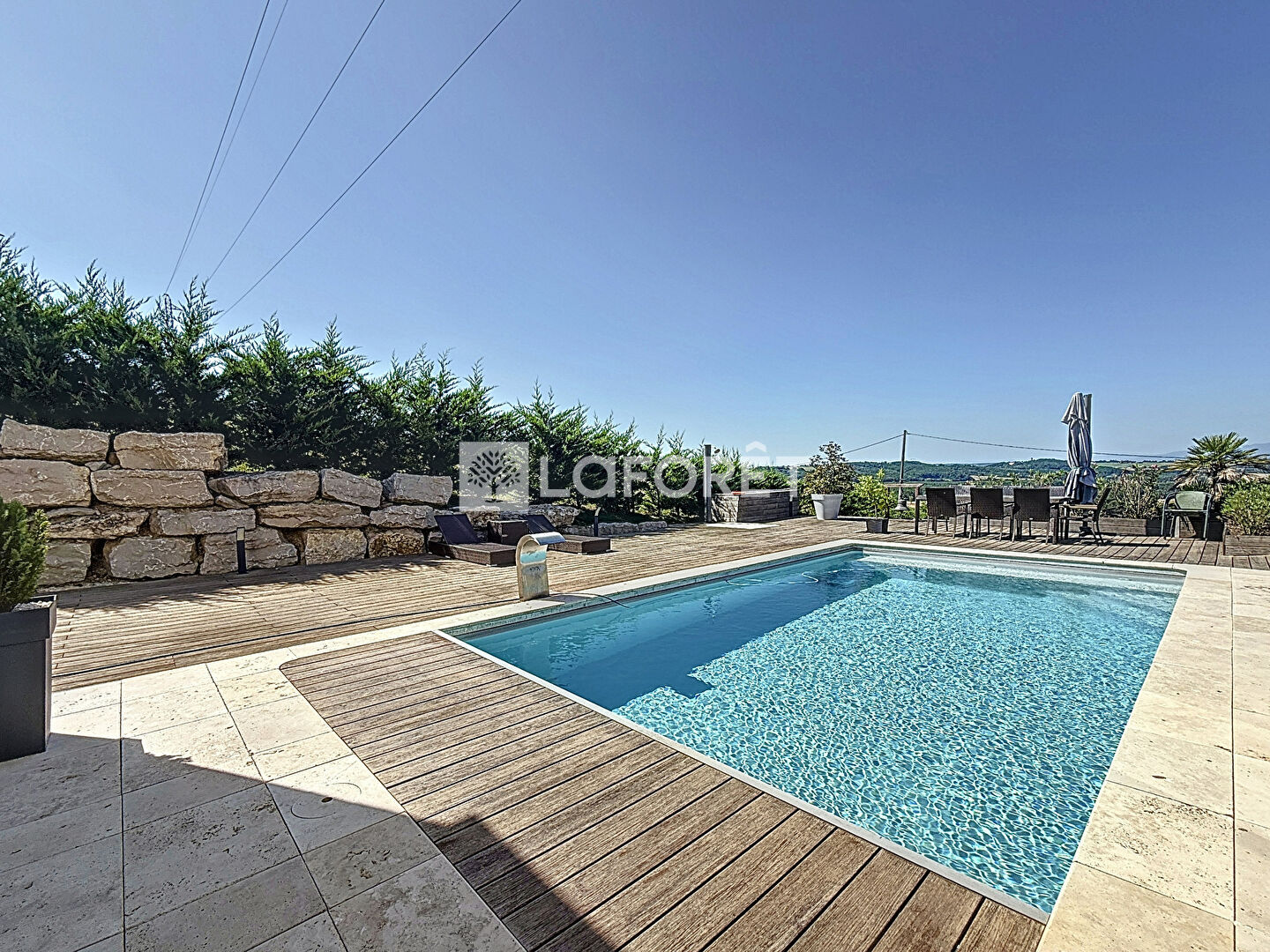 Côté extérieur, vous serez séduit par sa terrasse d'environ 200 m² exposée à l'OUEST , sa piscine et son cadre exceptionnel avec vue panoramique sur le massif du Pilat, sans vis à vis.