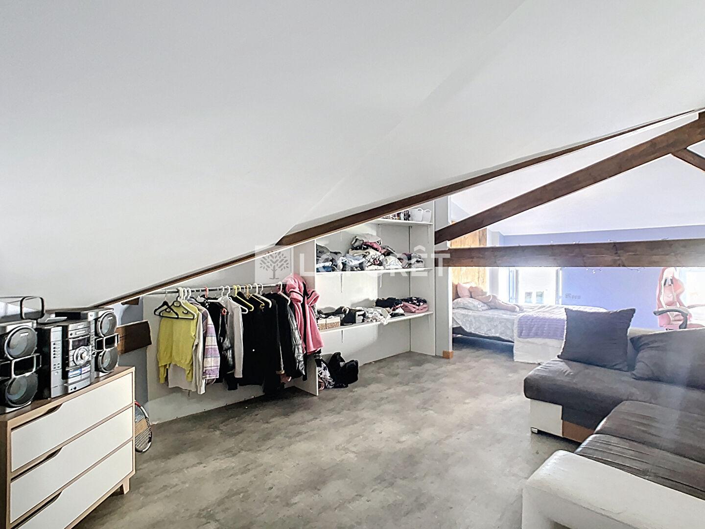 Premier étage lumineux : Un salon spacieux baigné de lumière naturelle, une salle de bains et une grande chambre.