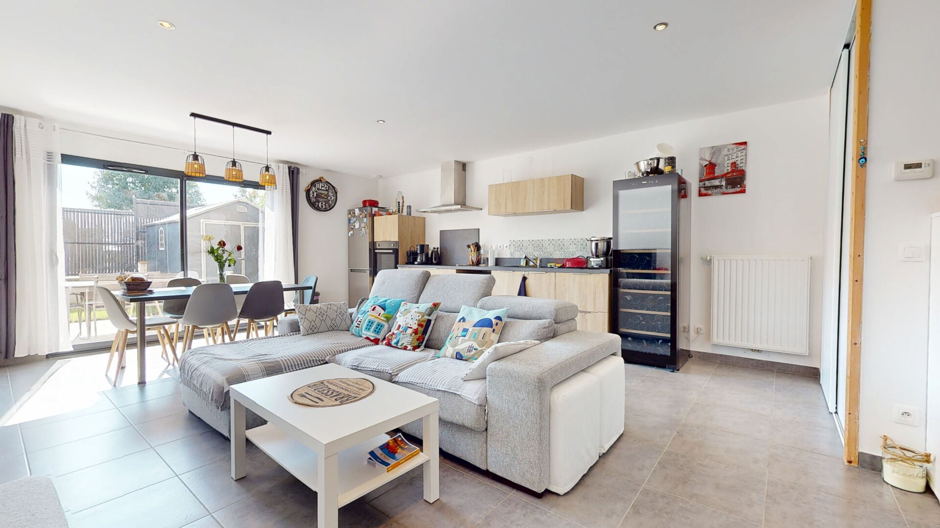 Au rez-de-chaussée, vous trouverez une entrée, une salle d'eau avec WC, une cuisine ouverte entièrement équipée ainsi qu'un salon/séjour spacieux de 40 m², équipé de placard muraux, avec accès direct au jardin clos et arboré et sa terrasse carrelée.