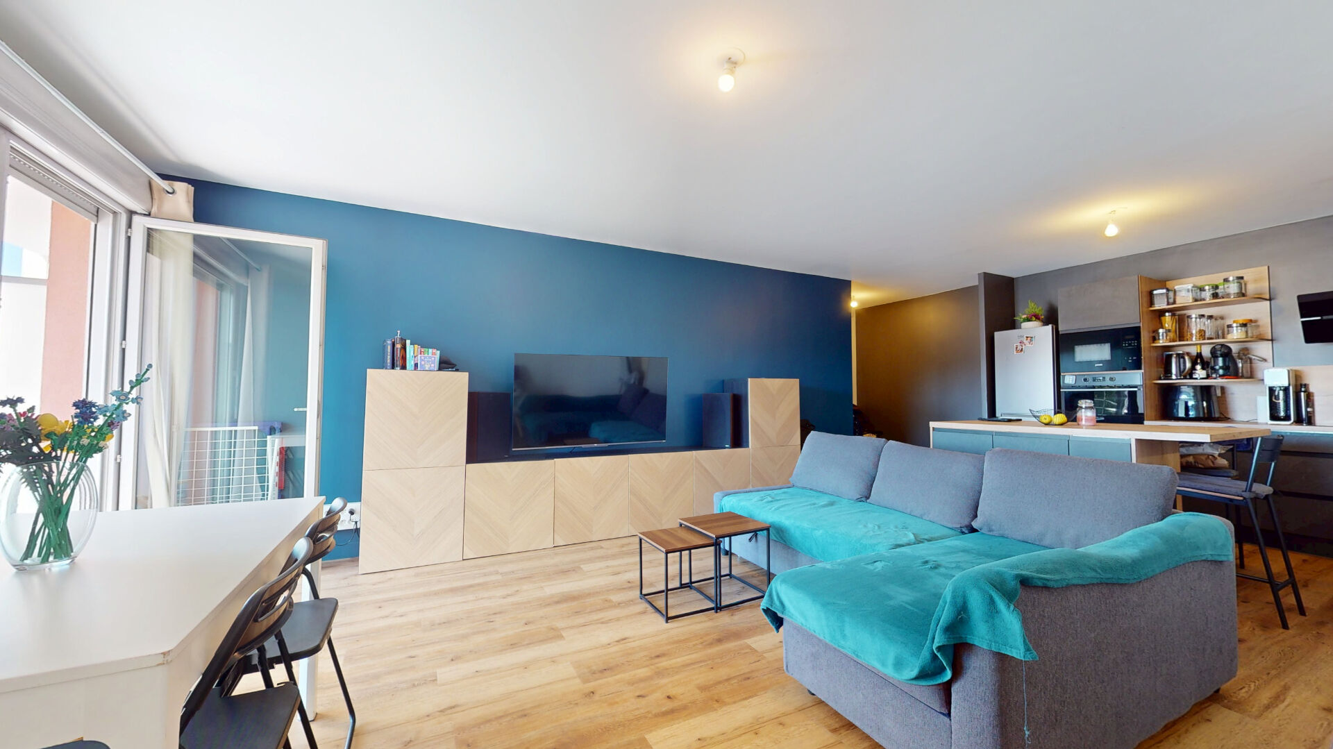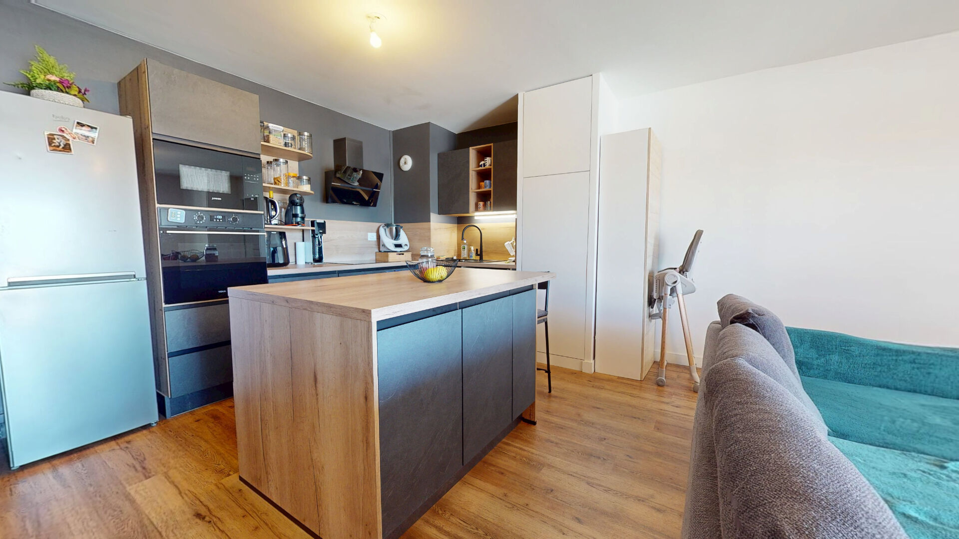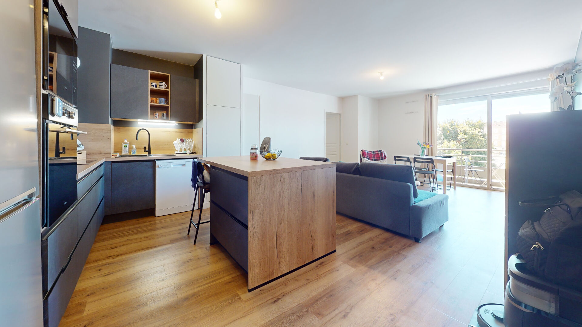 La pièce de vie est ouverte sur la cuisine. Un véritable espace coup de coeur pour les amateurs de cuisine moderne et de convivialité. Le séjour donne sur un balcon sans vis-à-vis, parfait pour vos moments de détente en extérieur.