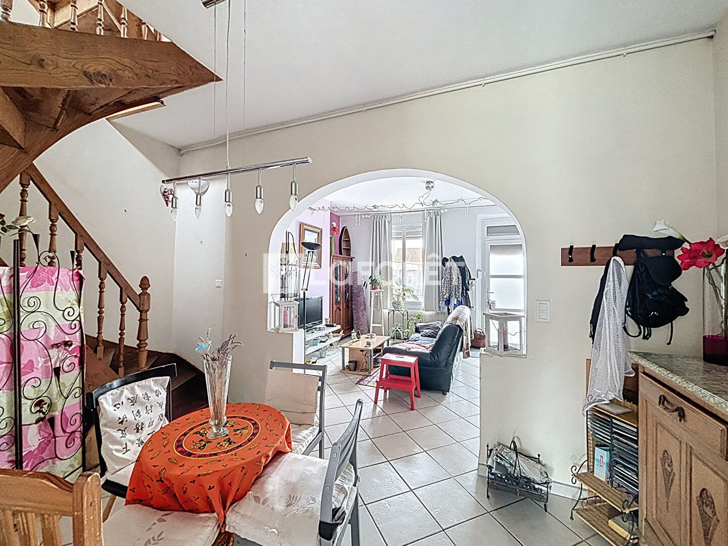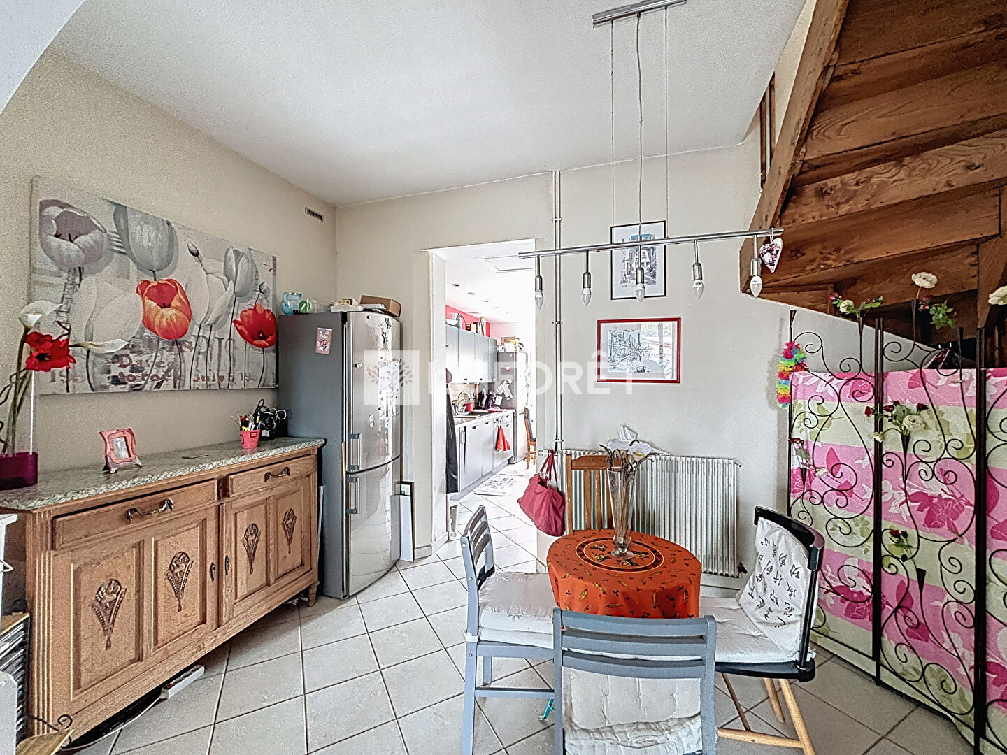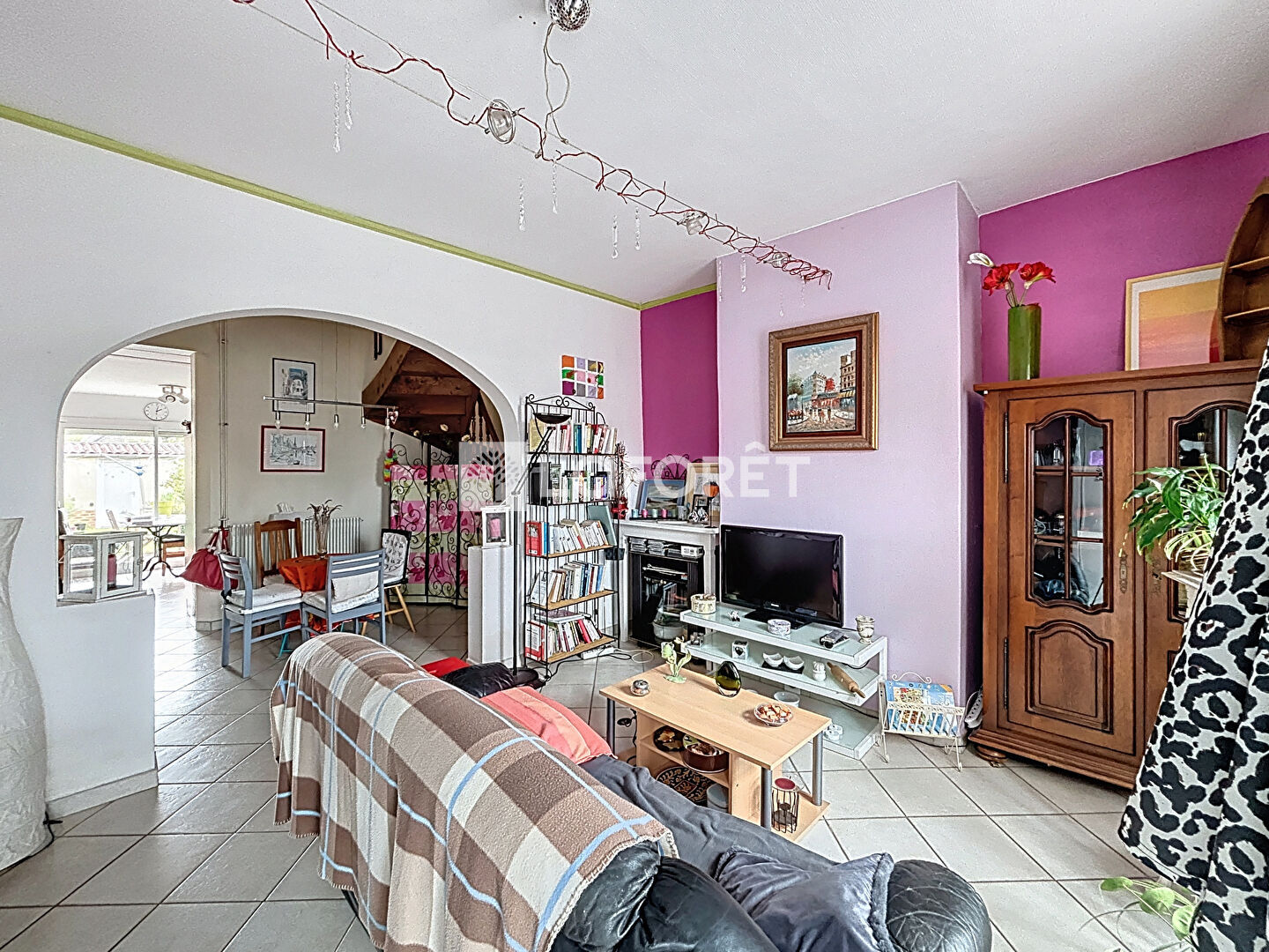 Au rez-de-chaussée : un bel espace de vie lumineux avec salle et salon, une cuisine équipée récente ouverte sur la terrasse grâce à une grande baie vitrée, une salle d'eau et des toilettes.