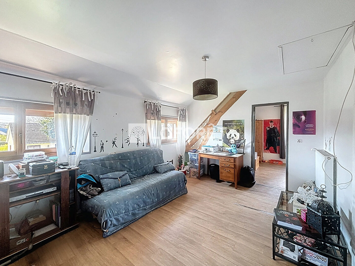 À l'étage, un grand palier servant de salon ou de salle de jeux distribue deux chambres spacieuses, ainsi qu'une salle d'eau avec WC.
