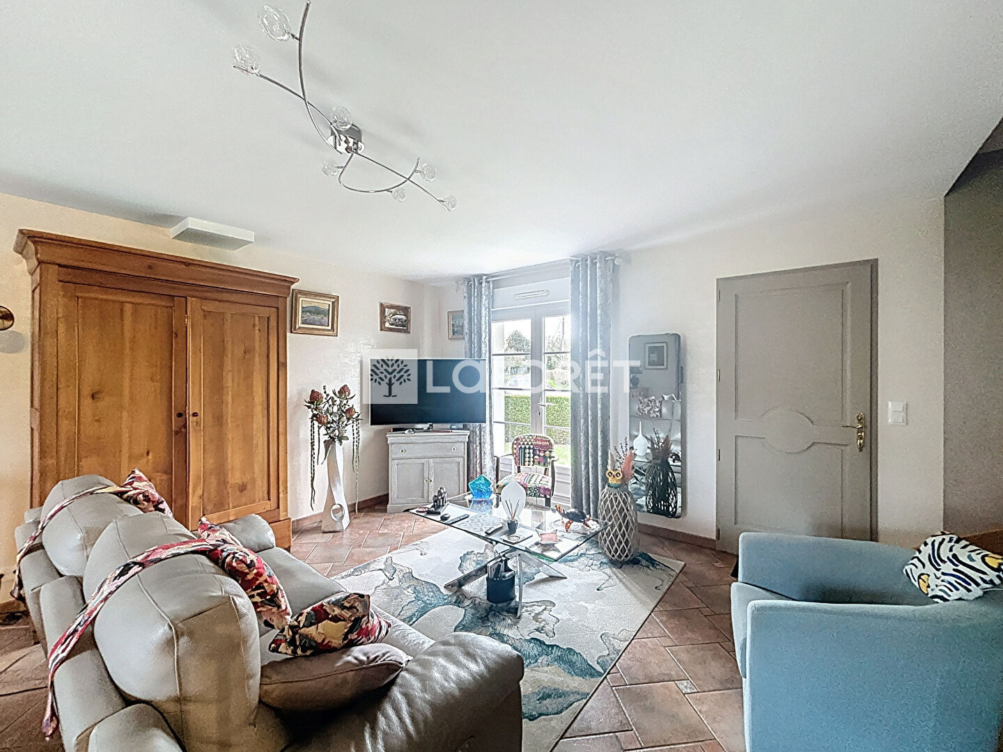Le rez-de-chaussée se compose d'un séjour-salon lumineux de 31 m², d'une cuisine indépendante aménagée avec accès direct à la terrasse, d'une chambre, d'une salle de bains ainsi que de toilettes séparés.