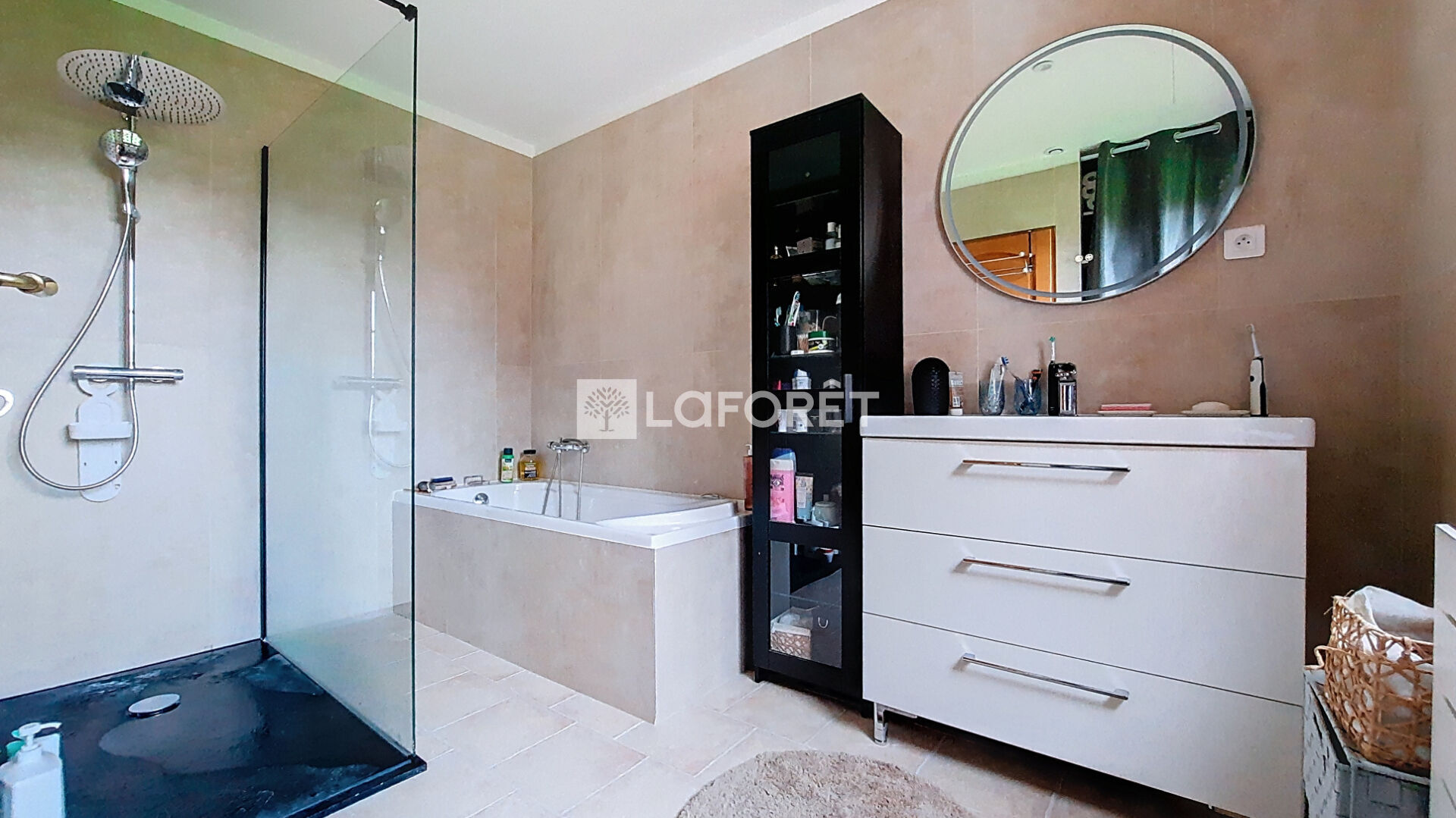 Une pompe à chaleur avec radiateur haut de gamme Daikin, une cheminée panoramique et un poêle à pellets assurent une chaleur douce et économique. Une salle de bains avec douche italienne et baignoire ainsi qu'une buanderie très pratique viennent compléter le rez de chaussée.