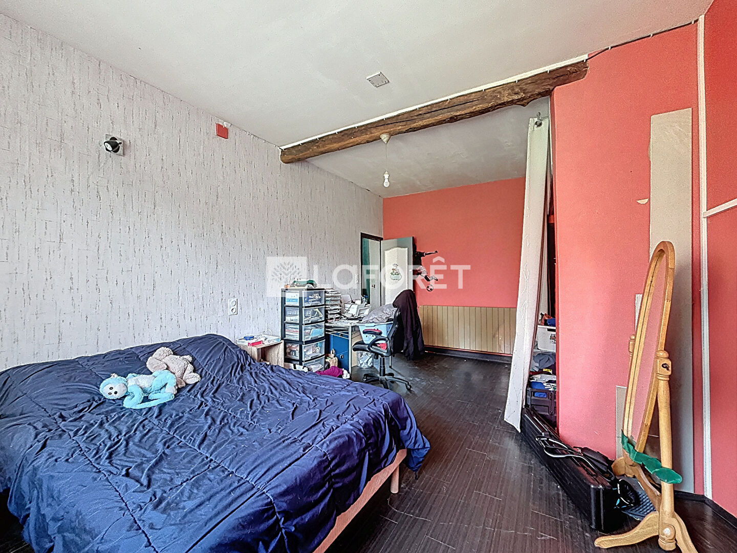 Elle se compose, au rez-de-chaussée, d'un beau séjour avec poêle à bois, d'une cuisine, d'une salle de bain, d'un WC, d'un cellier, d'un bureau pouvant faire dressing ainsi que d'une chambre de 20 m².