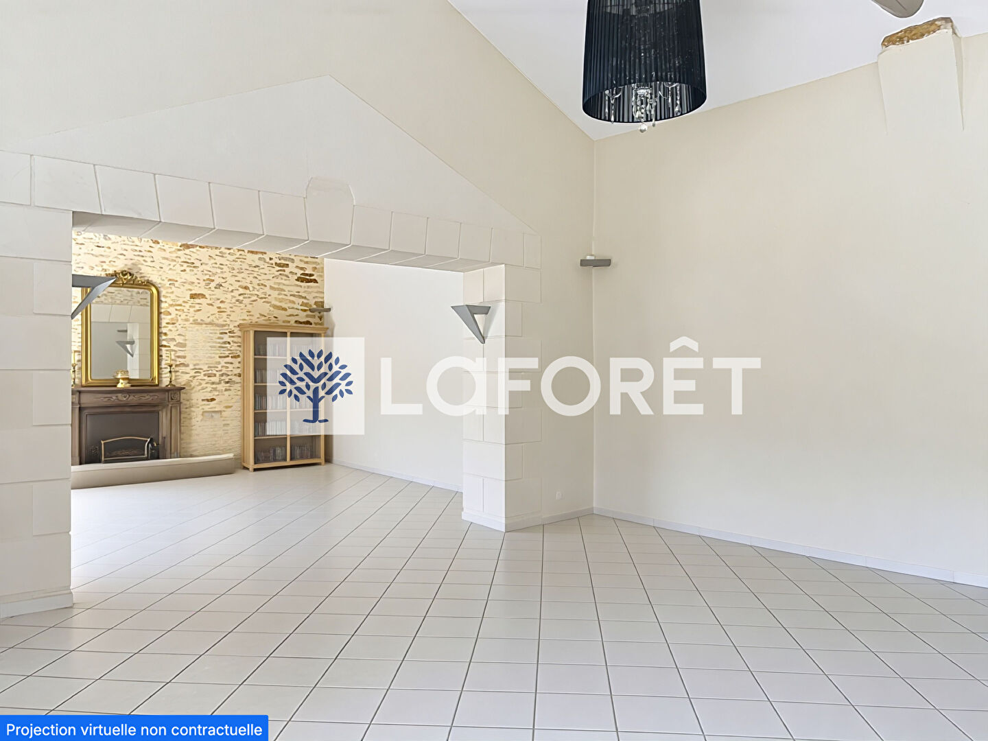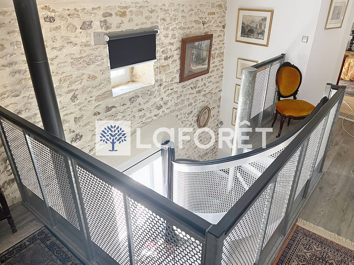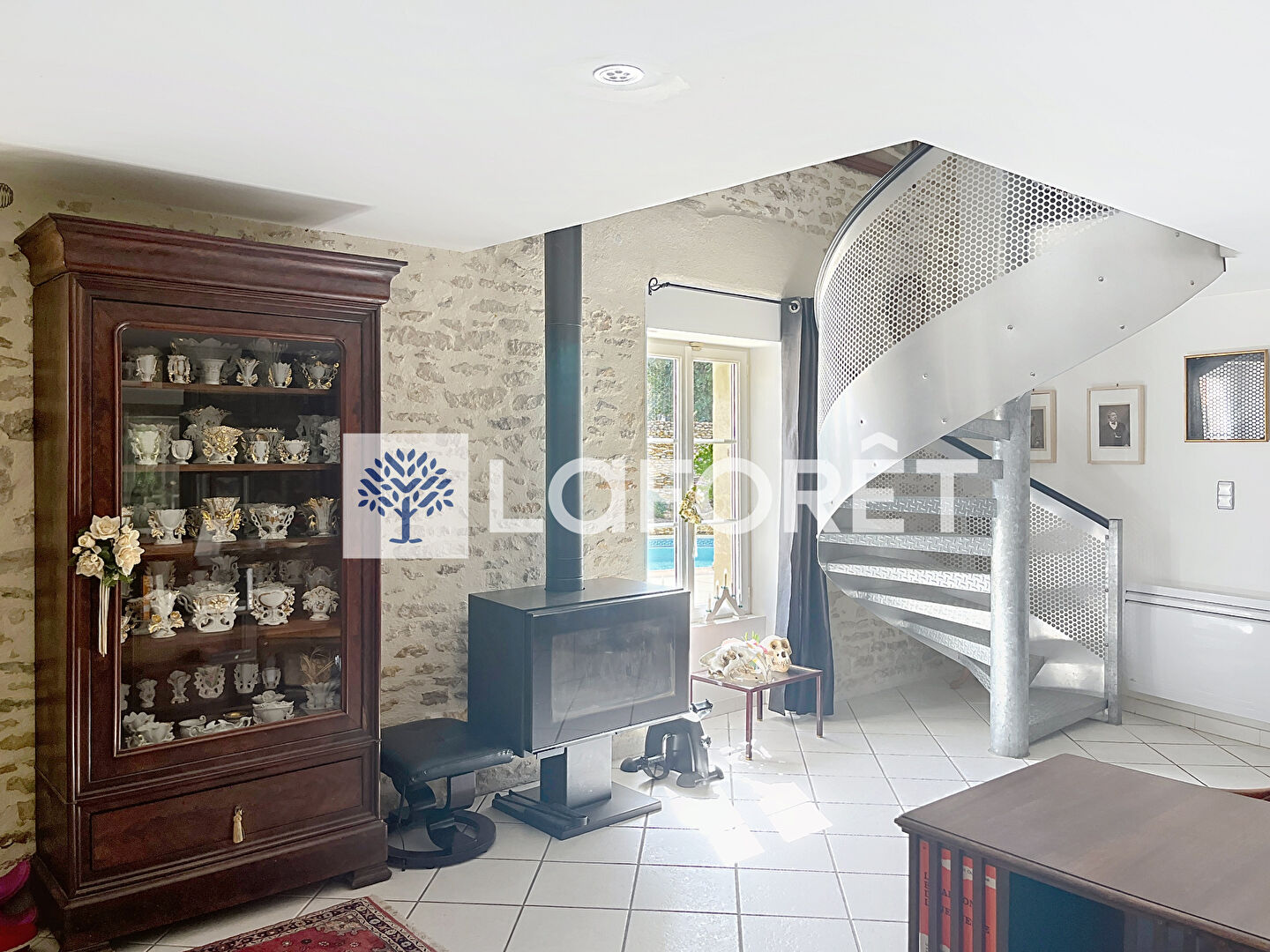 Un espace polyvalent de 36m2 pouvant vous servir de chambre ou bureau avec un poêle à bois , et la présence d'un élégant escalier en métal.