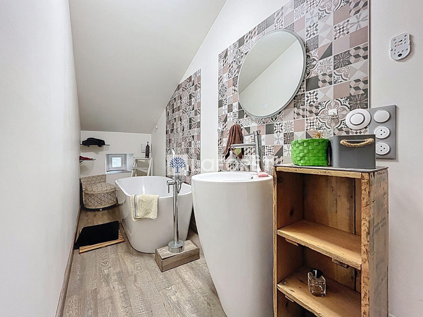 A l'étage une mezzanine avec charpente apparente, 2 chambres (14,80 et 21m2), une salle de bains, un toilette.