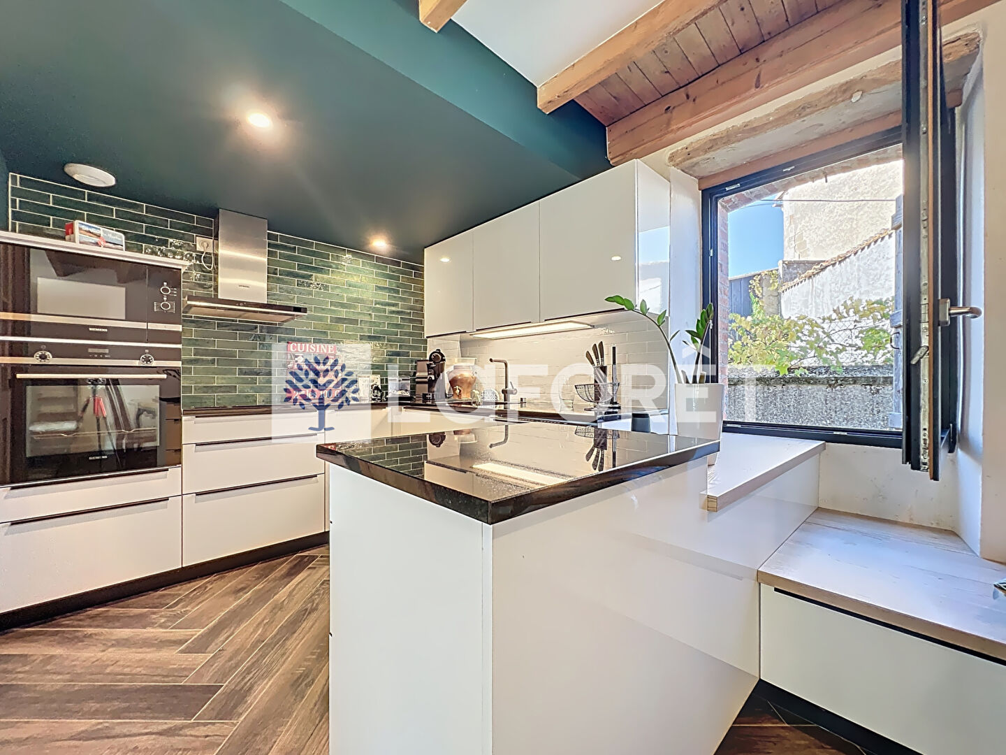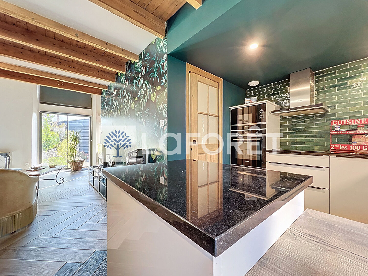 Cuisine ouverte, aménagée et équipée (plaques à induction, hotte, four, micro-ondes, lave-vaisselle),