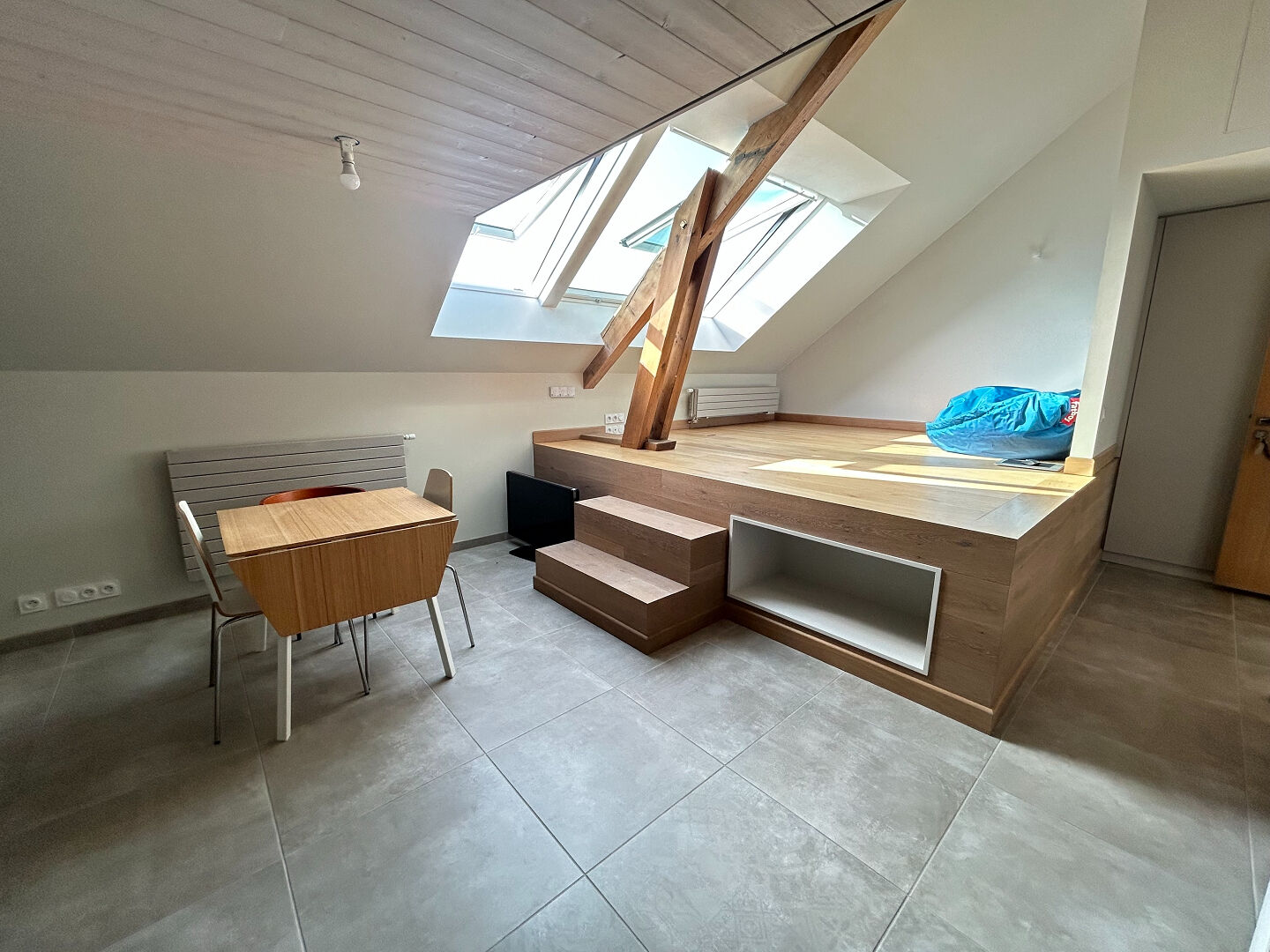Ce bien lumineux et plein de charme se compose d'une cuisine ouverte sur un séjour, offrant un bel espace de vie. Une mezzanine vient compléter l'ensemble, parfaite pour un coin bureau, un espace détente ou un couchage supplémentaire.