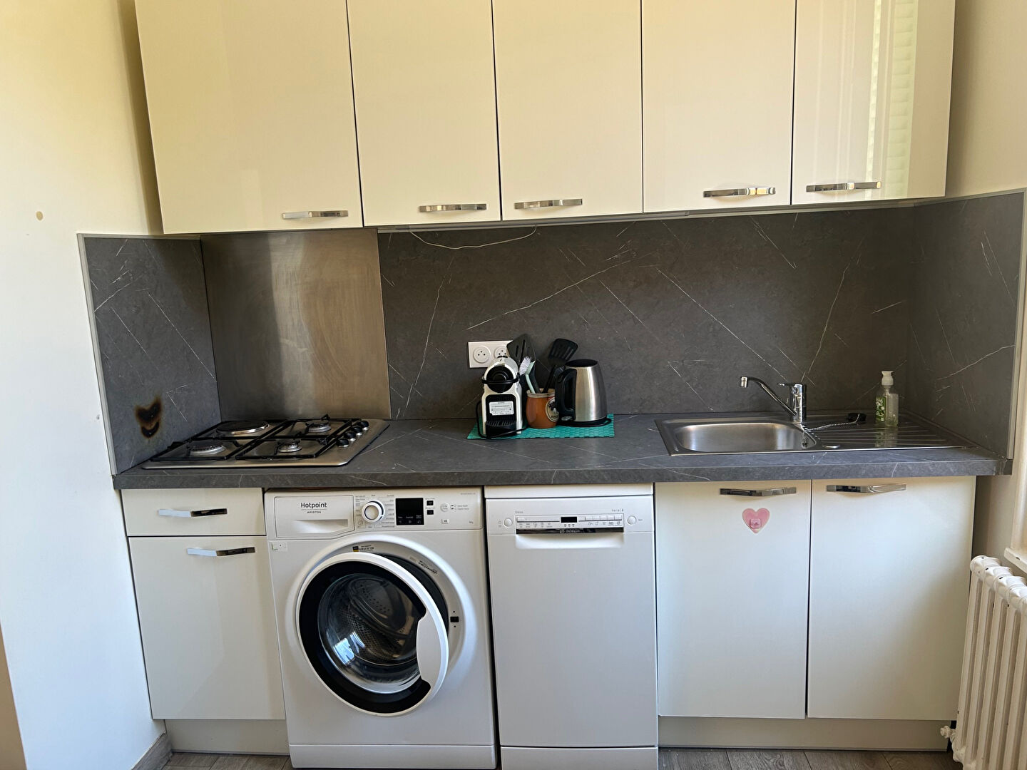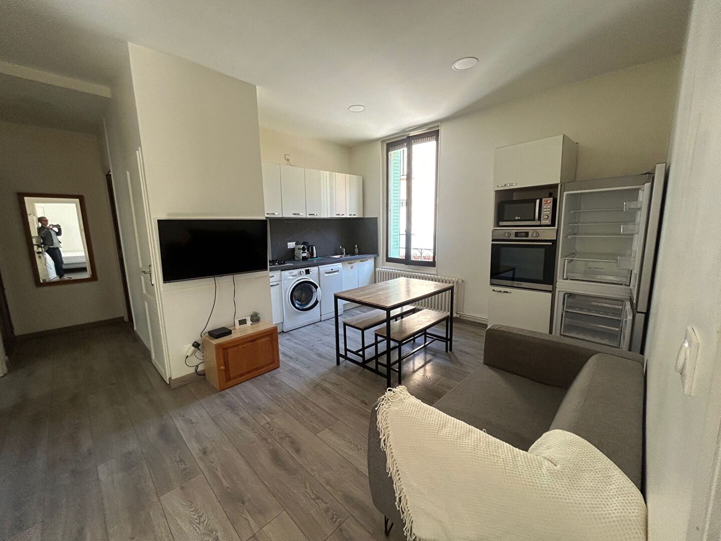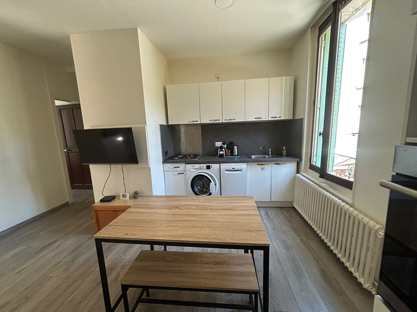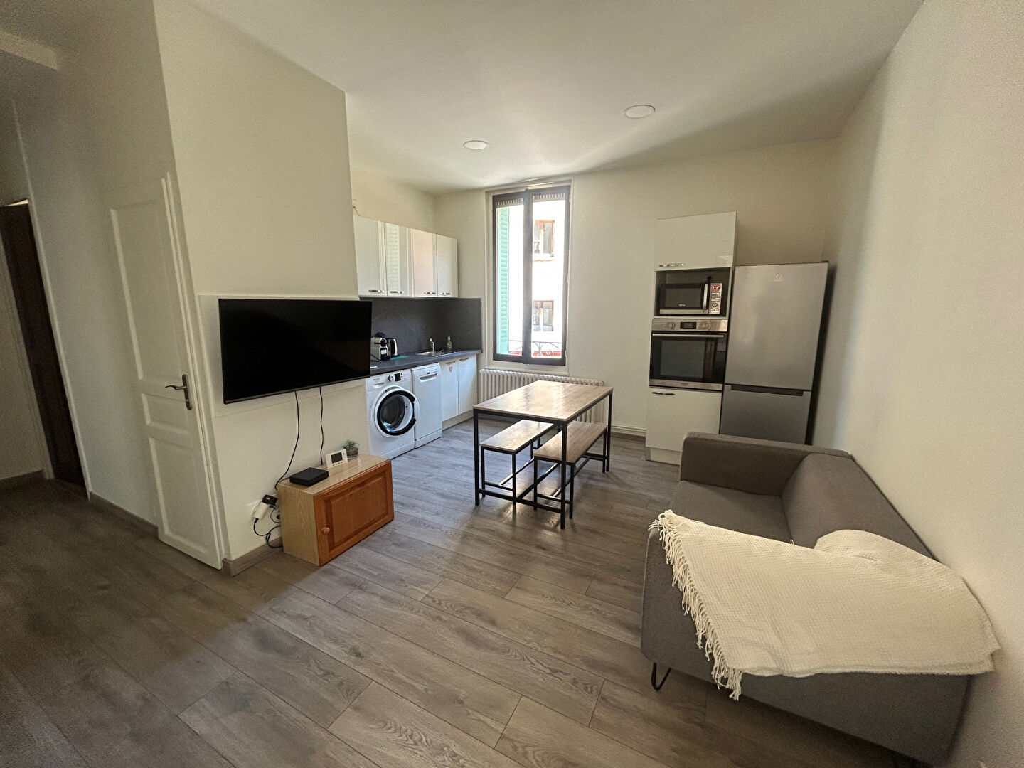 T4 de 59.78 m2 Meublé composé d'une cuisine aménagée-équipée (Lave-Vaisselle, Four, Plaques, Réfrigérateur avec congélateur, Lave-Linge) ouverte sur séjour, une salle de bains avec toilette, 1 wc indépendant, une cave de 6 m2, une chambre de service indépendante pour les 3 locataires.
