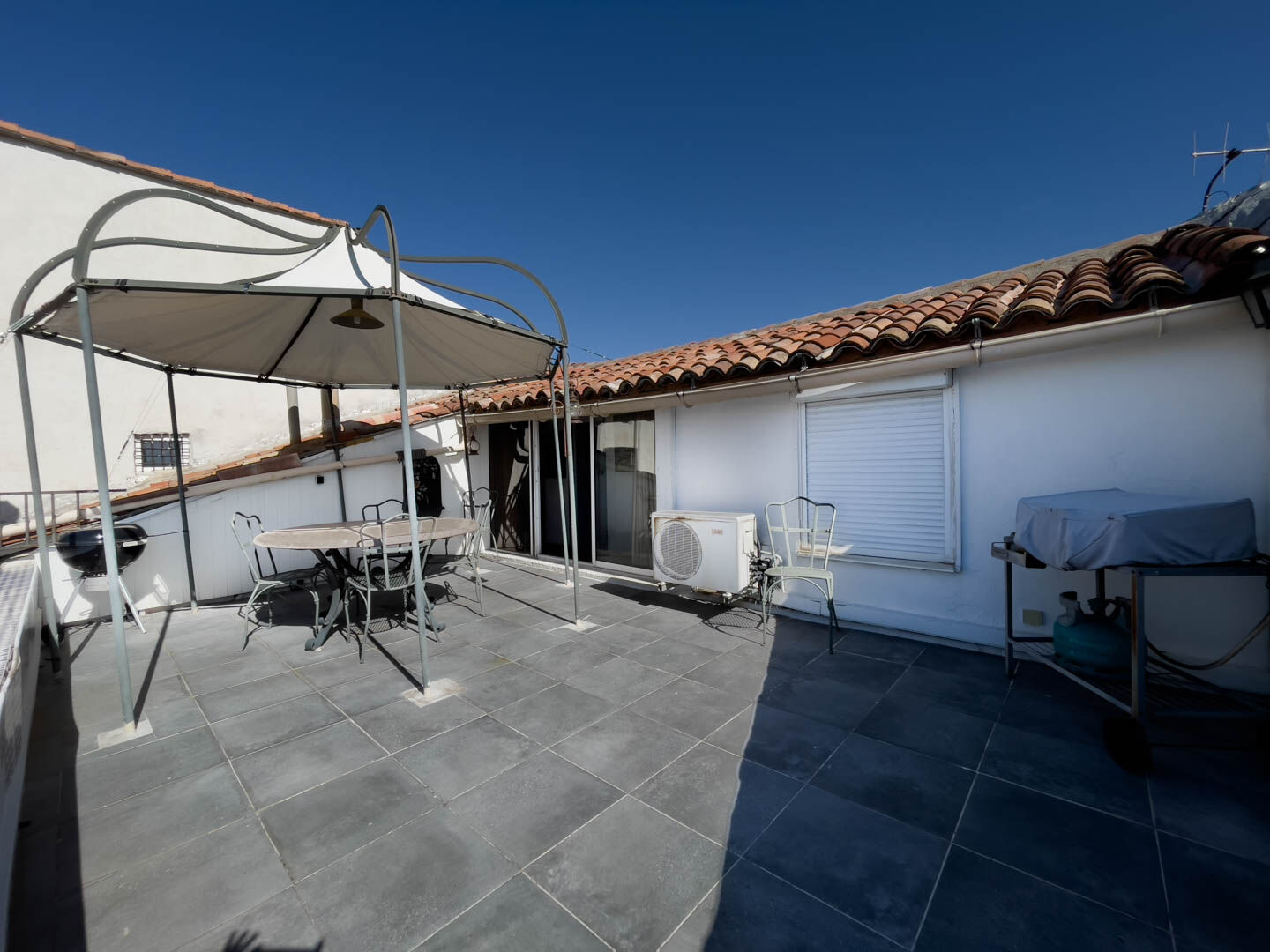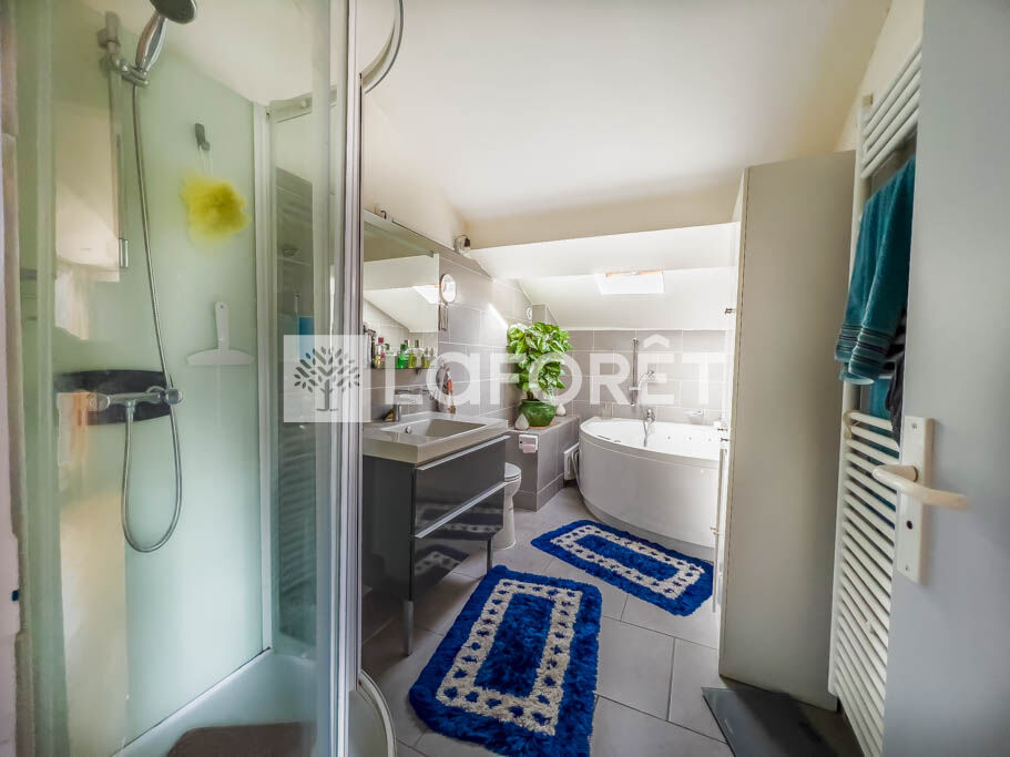 A l'étage : une salle de bain rénovée avec douche, wc et baignoire balnéo, une pièce avec dressing, une chambre de 10 m²* ainsi qu'une terrasse de 23 m²* avec une belle vue dégagée.