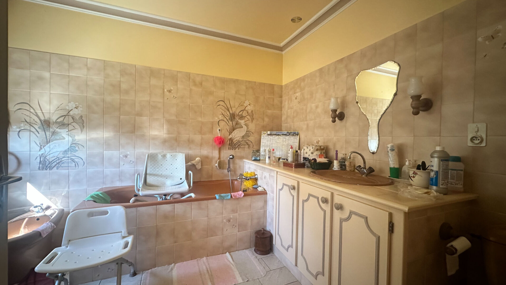 A l'étage : séjour de 34 m² *, cuisine indépendante de 21 m² * , 3 chambres, salle de bain, WC