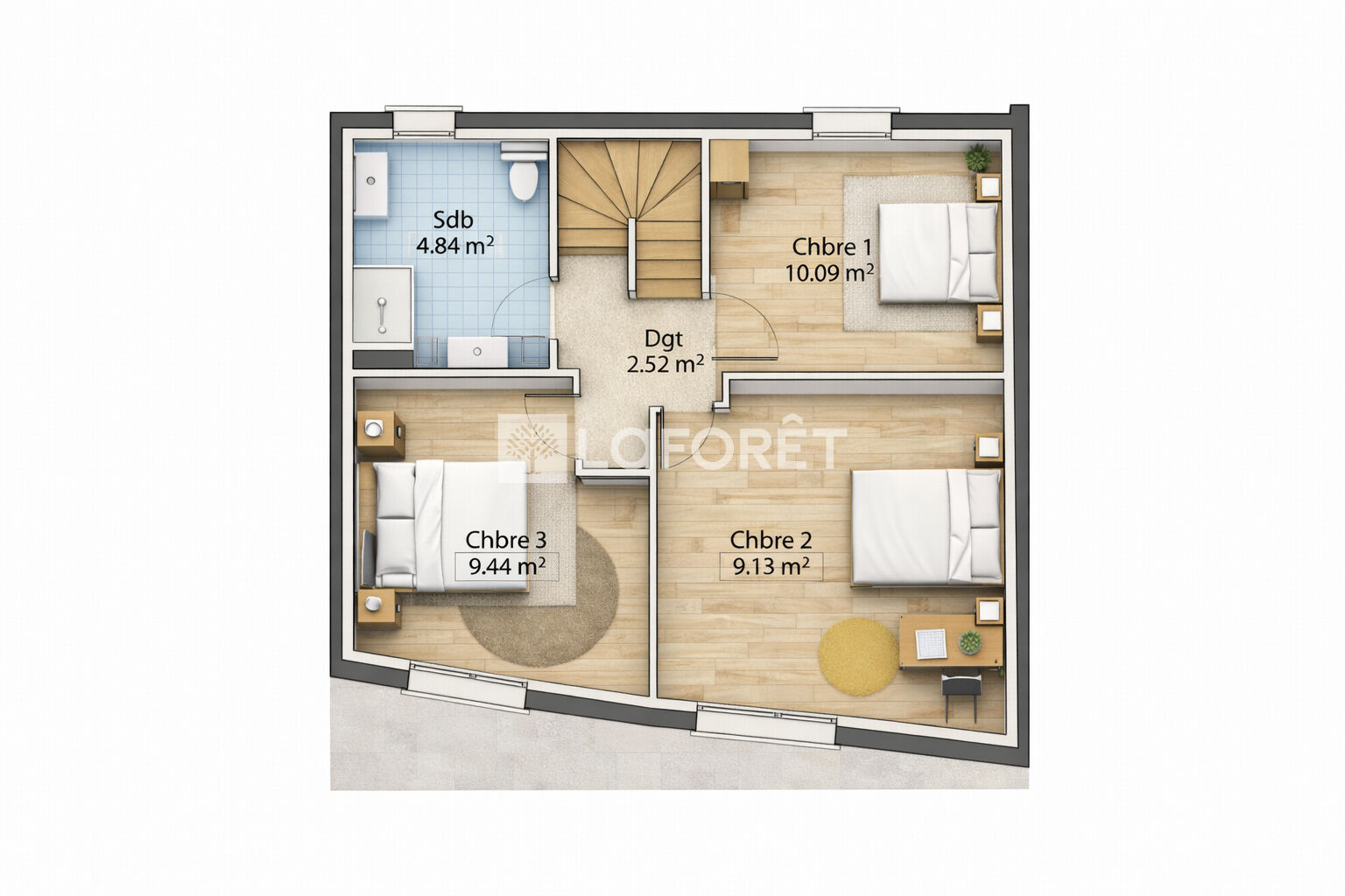 Un dégagement dessert 3 chambres, une salle de bains et un second WC.