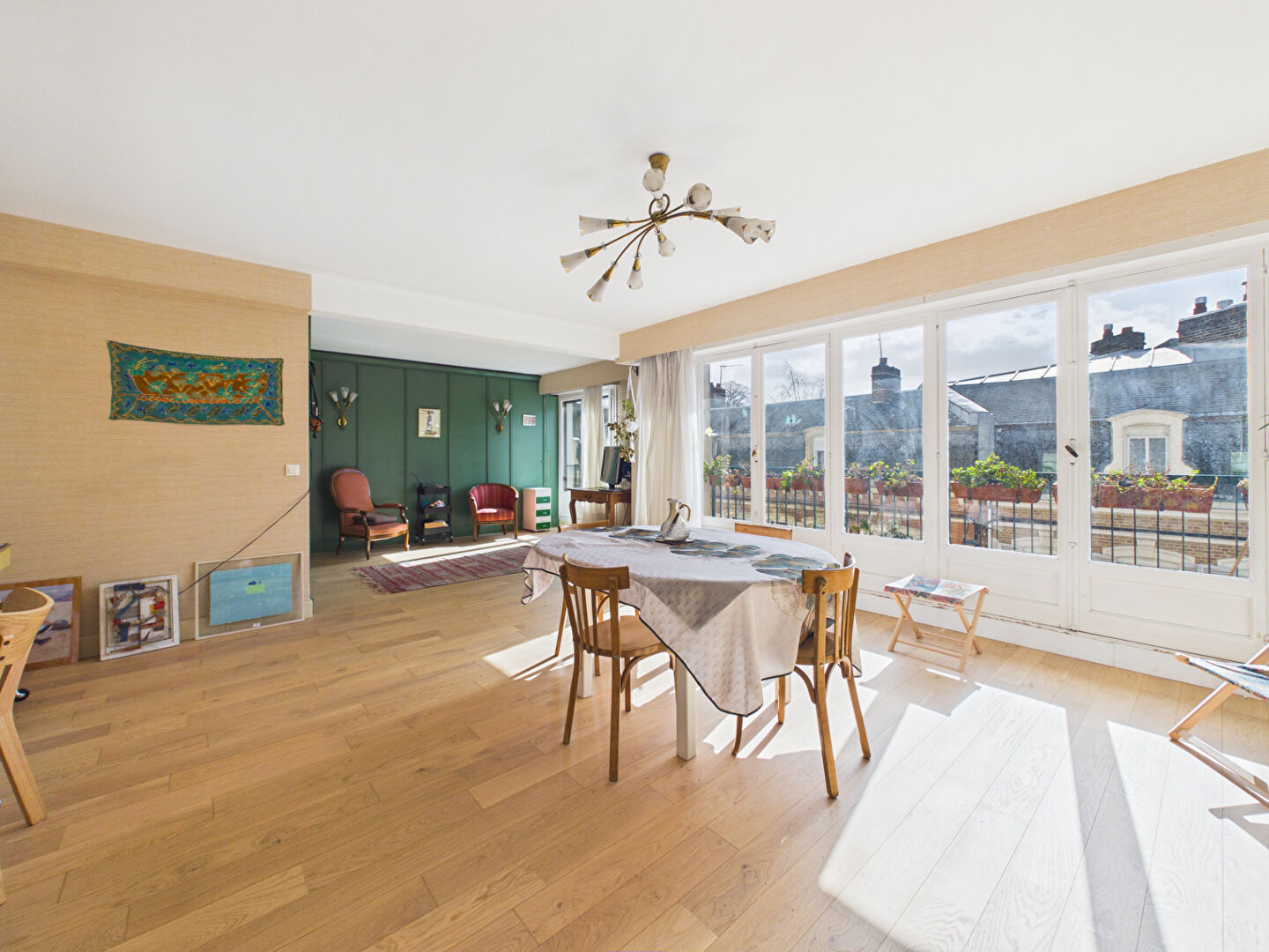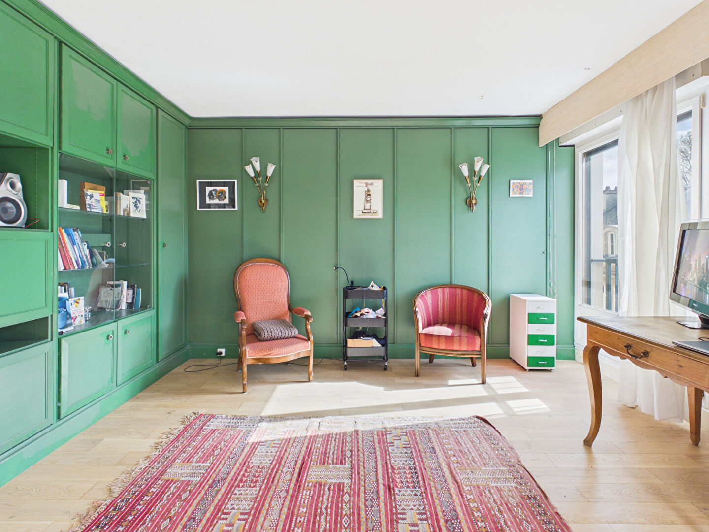 L'appartement se compose d'un hall d'entrée desservant un superbe séjour double de 43 m², sur parquet, particulièrement lumineux grâce à son exposition sud-ouest, avec accès à un balcon de 6 m².