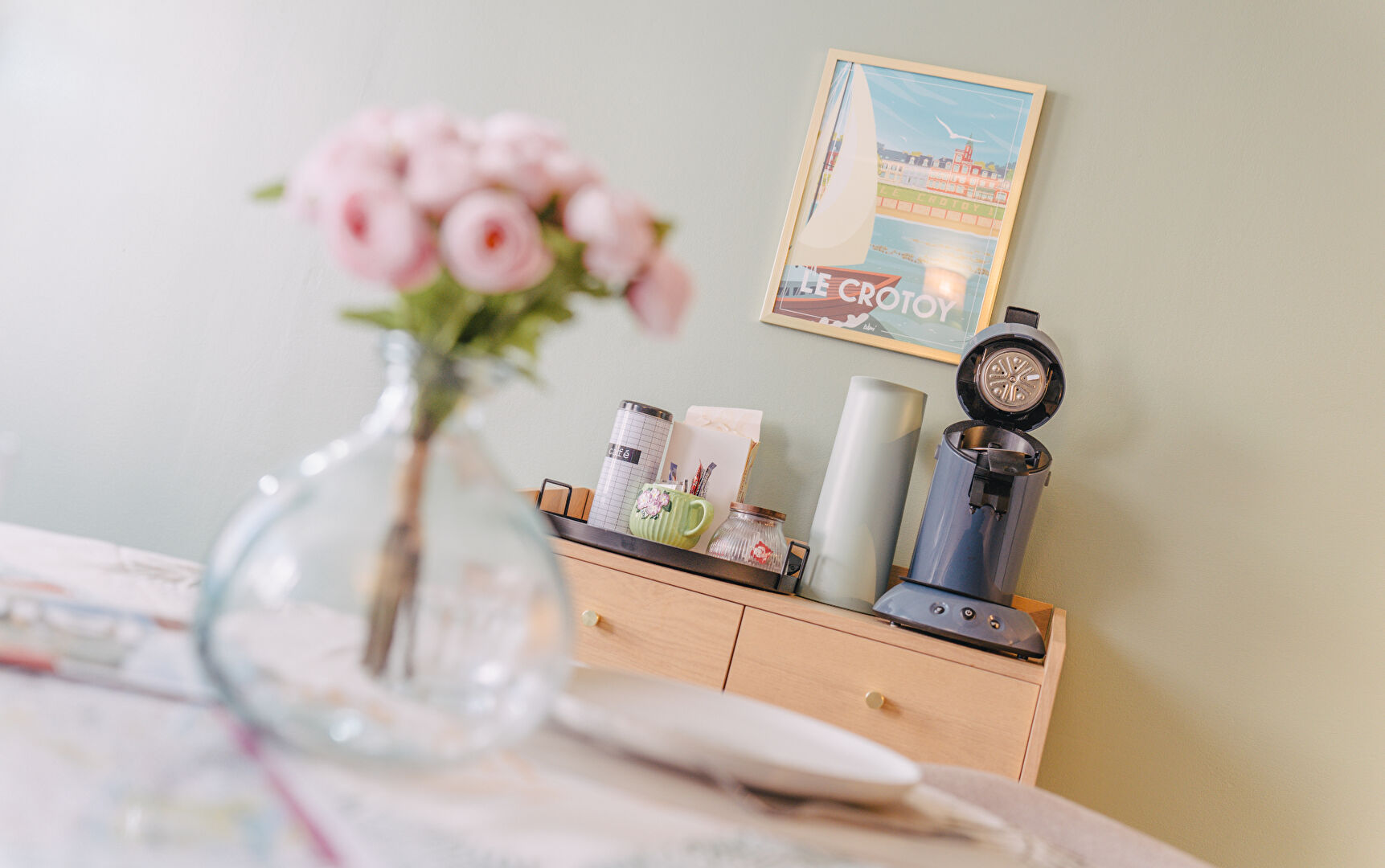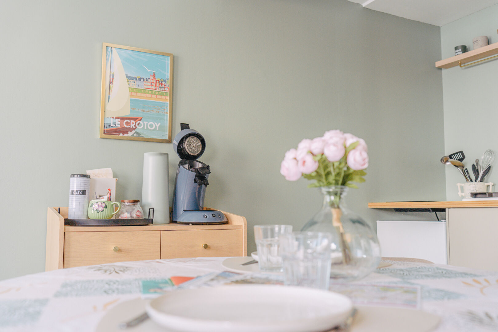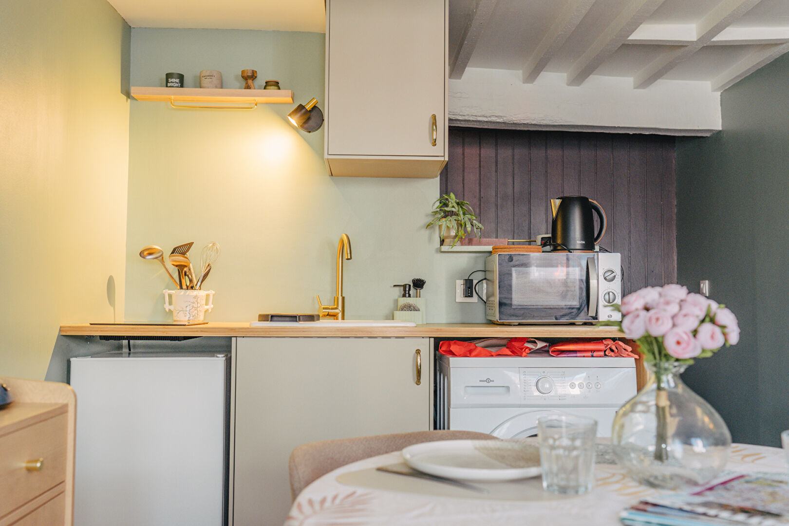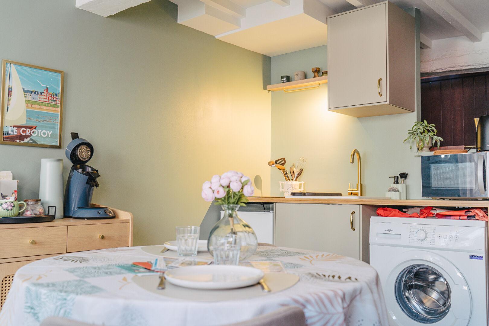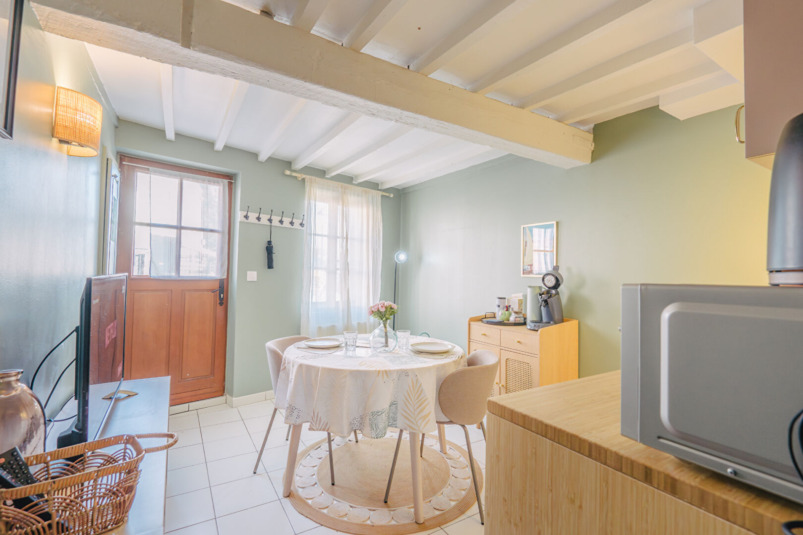 D'un séjour convivial avec cuisine aménagée et équipée, d'un WC séparé, à l'étage, d'une chambre spacieuse et d'une salle d'eau,