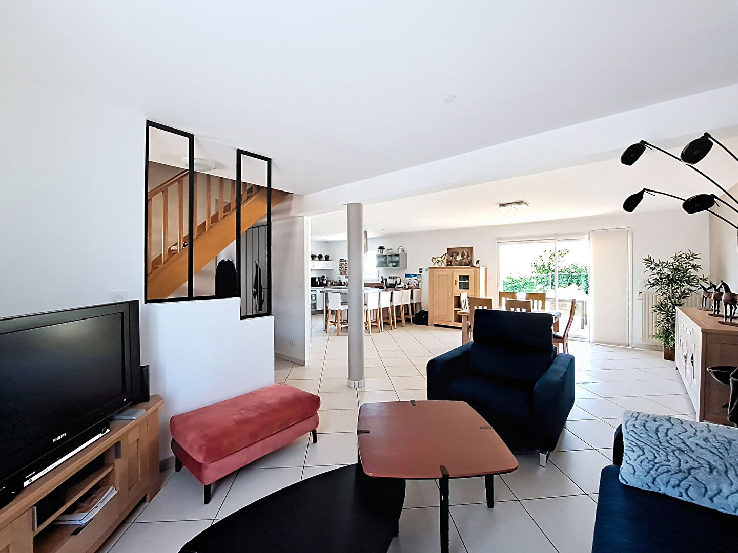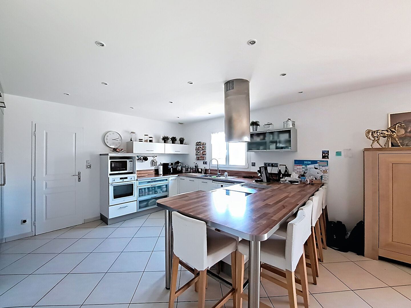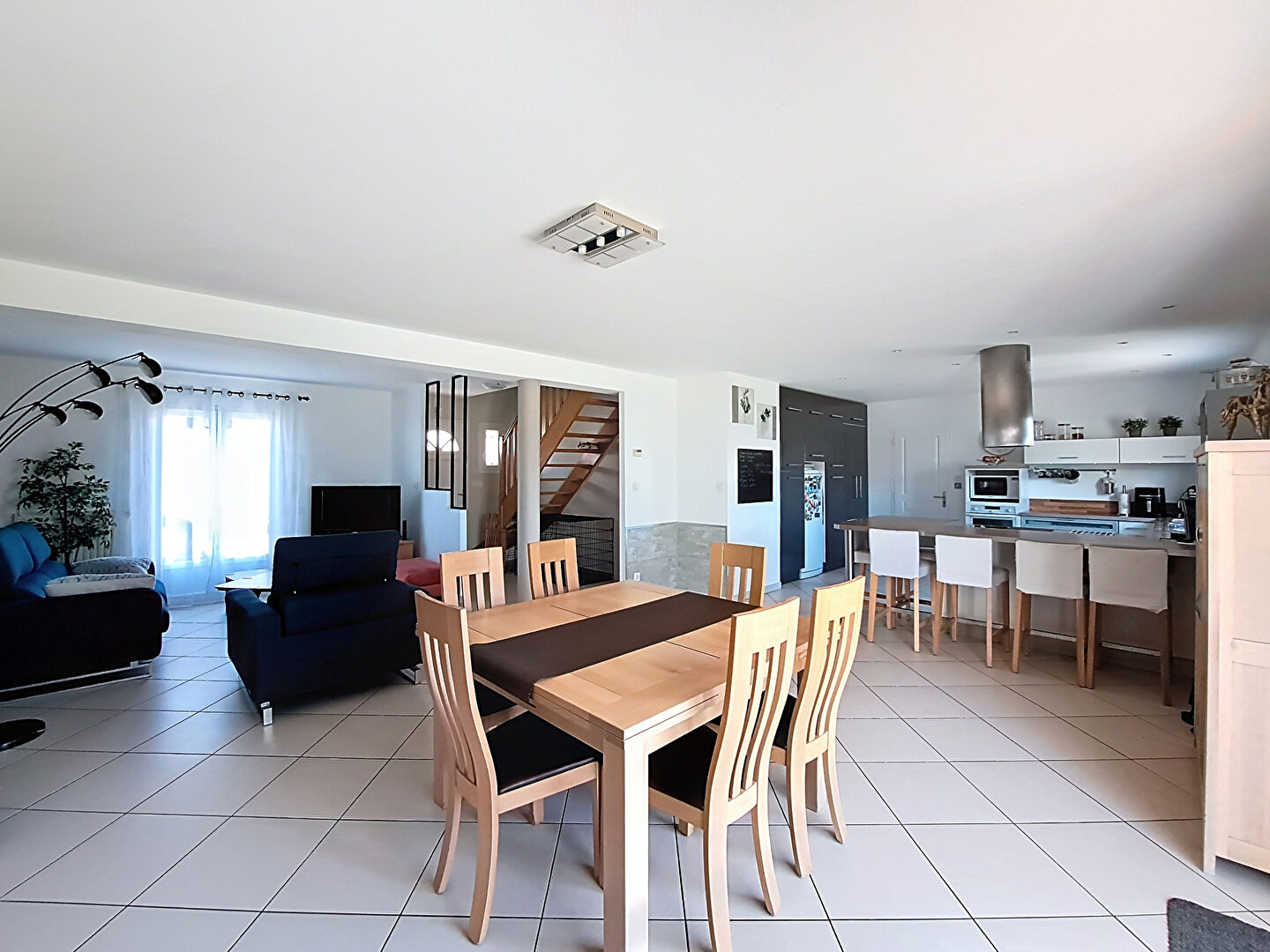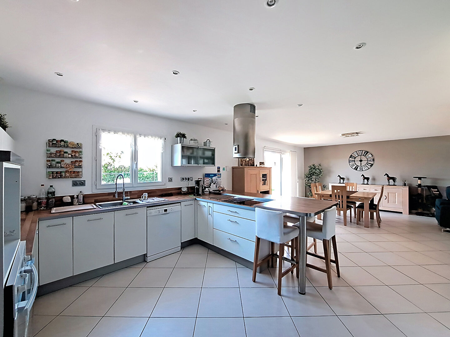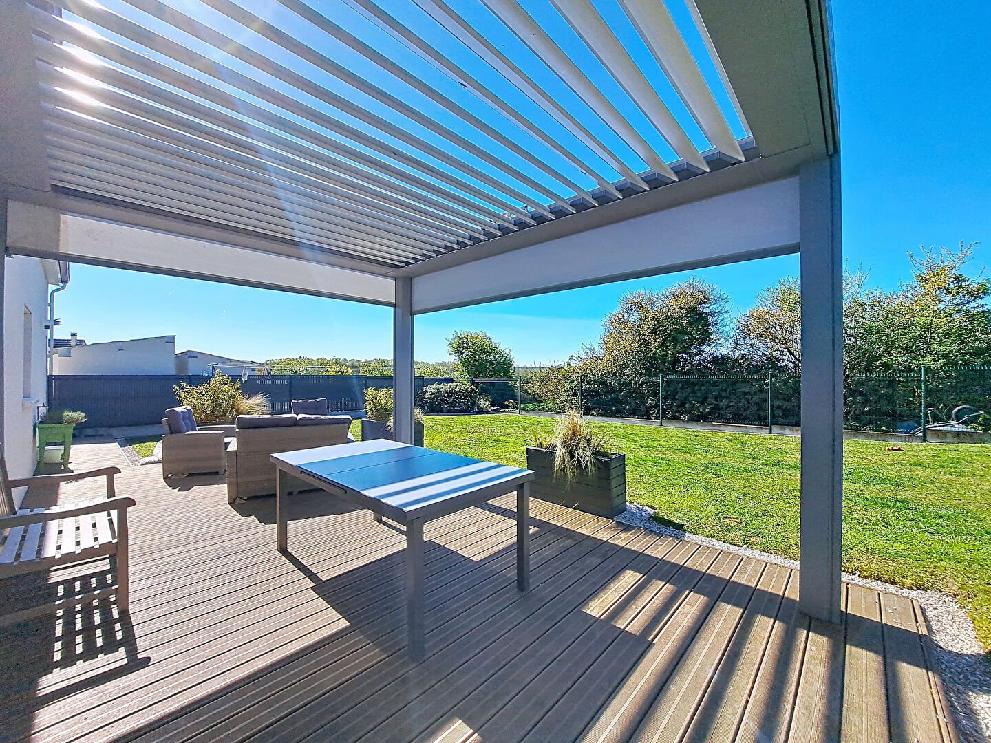 Au rez-de-chaussée, une entrée avec un vestiaire, une pièce de vie lumineuse et traversante de plus de 56 m² avec accès sur une terrasse de 40 m² équipée d'une pergola bioclimatique, une cuisine aménagée et équipée avec un grand îlot central, ayant accès à une buanderie puis au premier garage. Vous trouverez une chambre de plain pied et un toilette séparé avec lave-mains.