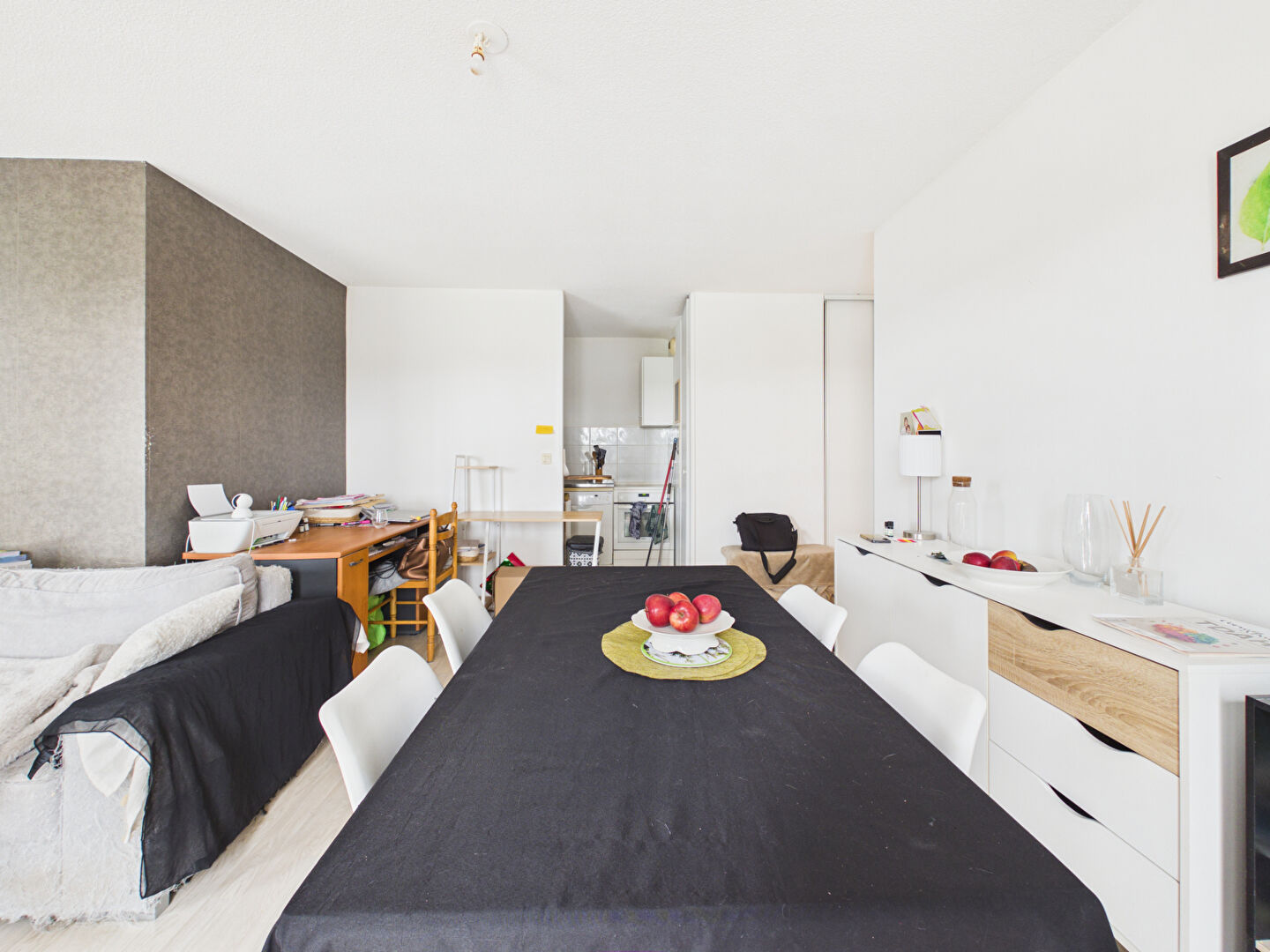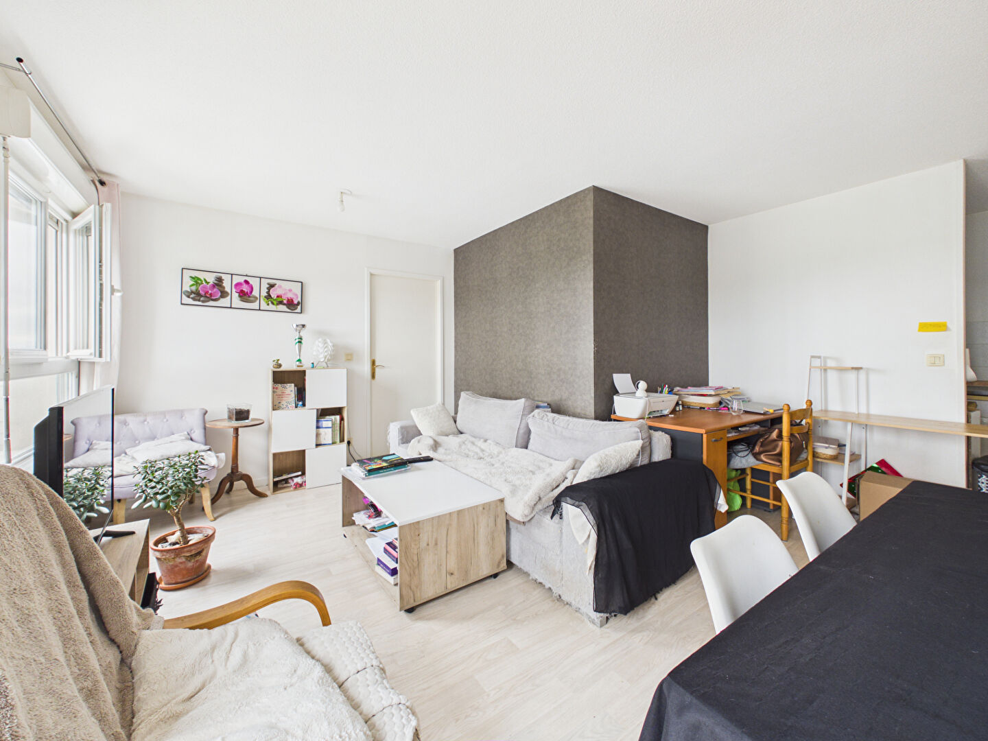d'un salon-séjour lumineux ouvert sur un coin cuisine ;