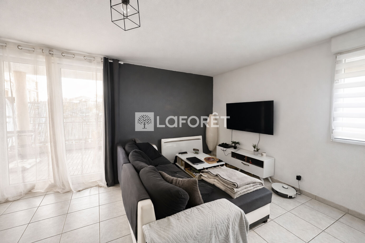 Ce logement présente un séjour lumineux offrant un accès direct à une terrasse couverte de 15 m², une cuisine moderne et équipée ouverte sur le séjour, une chambre et un agencement optimisé pour le confort au quotidien.