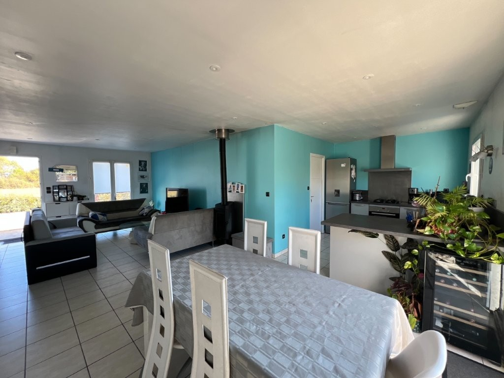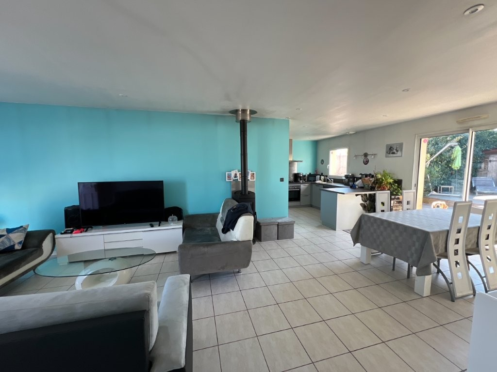 Un salon-séjour lumineux avec un poêle à bois et une cuisine aménagée et équipée .