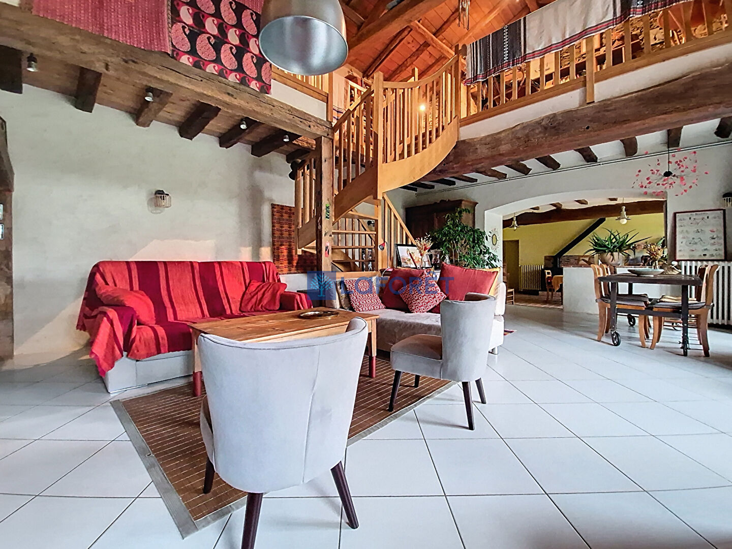 Vous découvrirez un salon cathédrale aux volumes impressionnants, sublimé par ses poutres apparentes et sa cheminée,créant une atmosphère chaleureuse et conviviale.