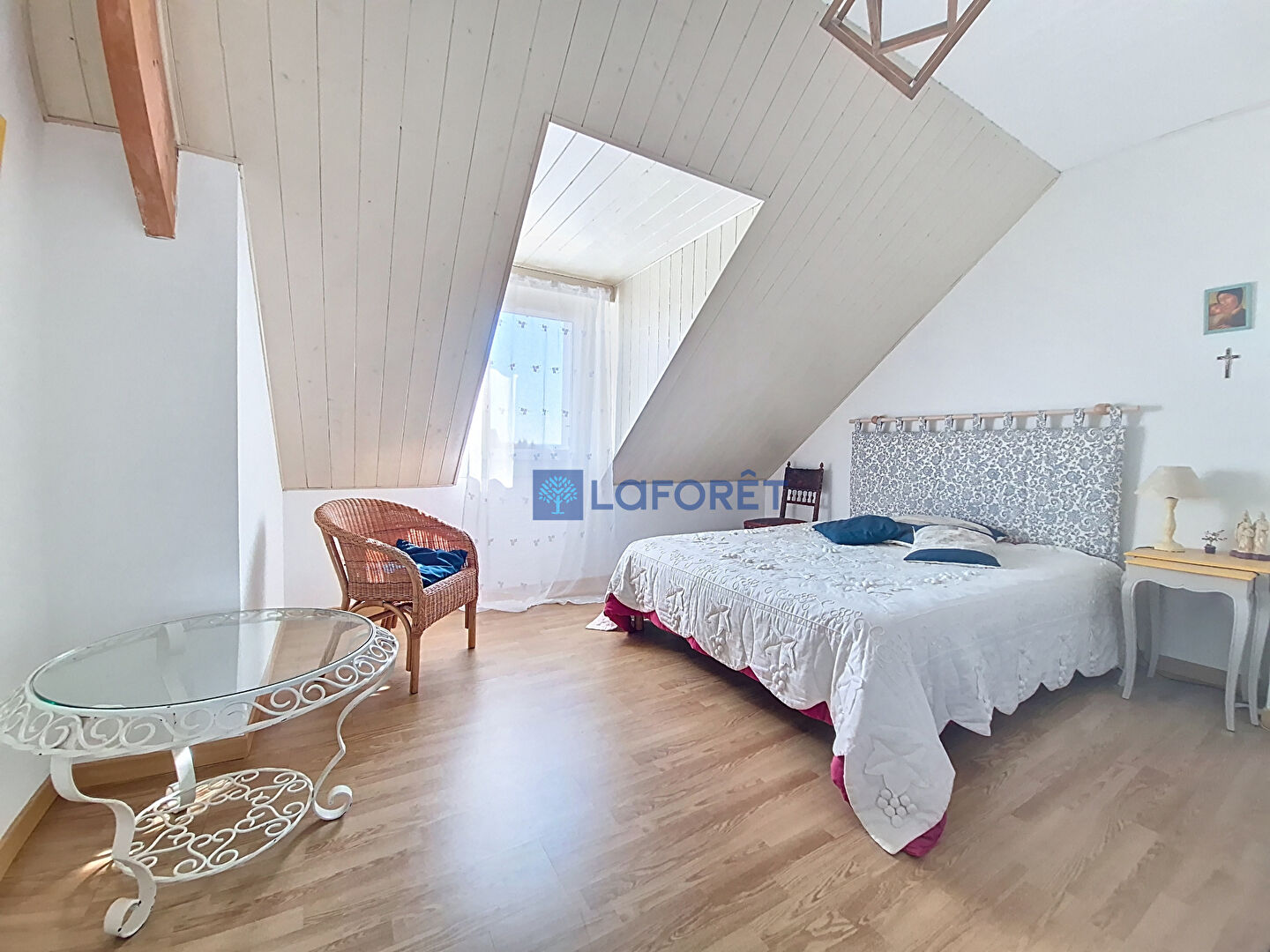 A l 'étage 2 chambres ,une salle de bains ainsi un grenier offrant un potentiel pour créer une chambre .