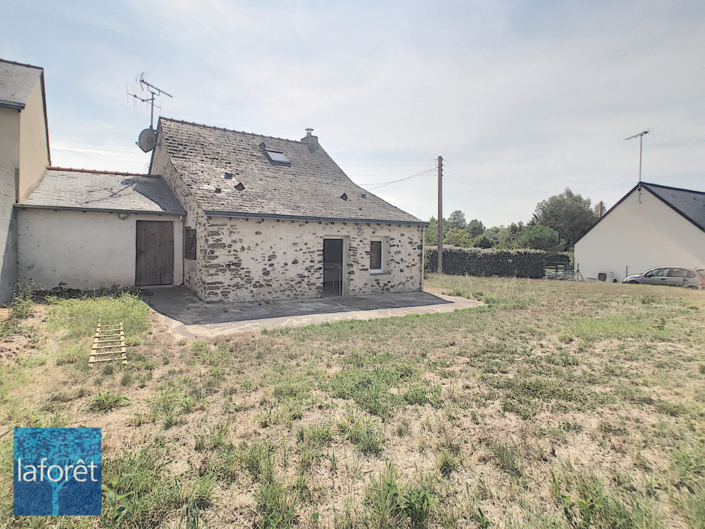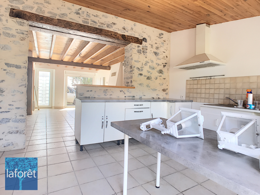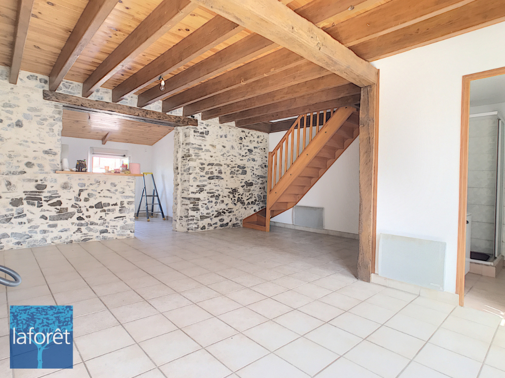 Cette maison vous offre une belle pièce de vie avec pierres apparentes et insert, ouverte sur une cuisine aménagée et une salle d'eau.