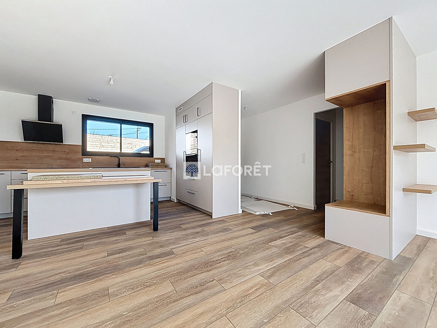 Maison de plain-pied comprenant une grande pièce de vie lumineuse avec une cuisine aménagée et entièrement équipée (plaque, hotte, four, micro-ondes, lave-vaisselle et réfrigérateur), trois chambres disposant chacune d'un dressing, une salle d'eau, un WC séparé, une buanderie et un garage avec portail électrique.