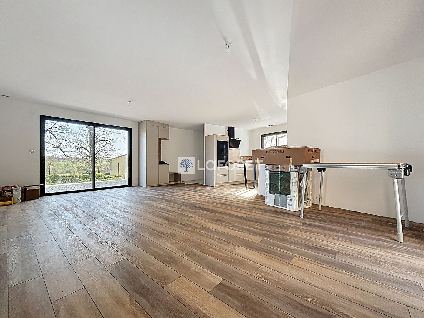 Maison de plain-pied comprenant une grande pièce de vie lumineuse avec une cuisine aménagée et entièrement équipée (plaque, hotte, four, micro-ondes, lave-vaisselle et réfrigérateur), trois chambres disposant chacune d'un dressing, une salle d'eau, un WC séparé, une buanderie et un garage.