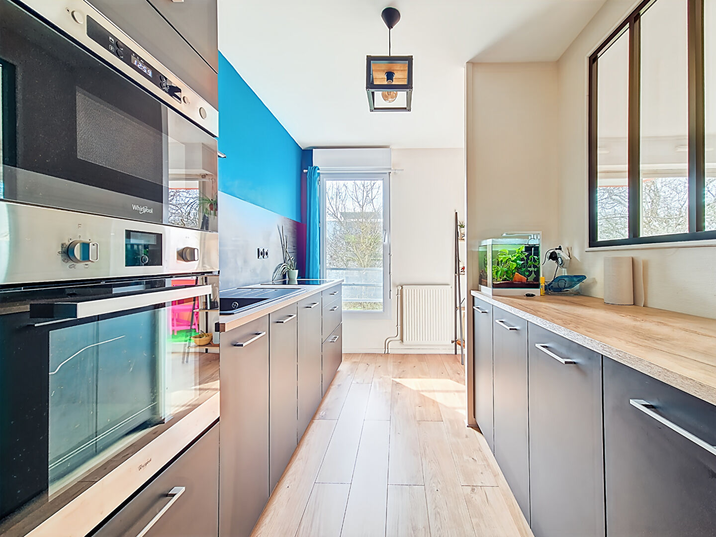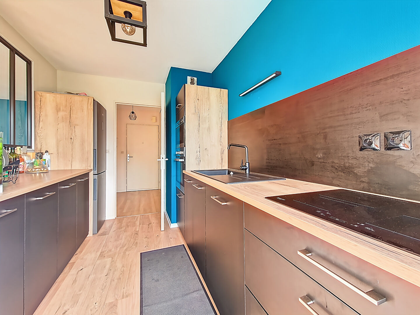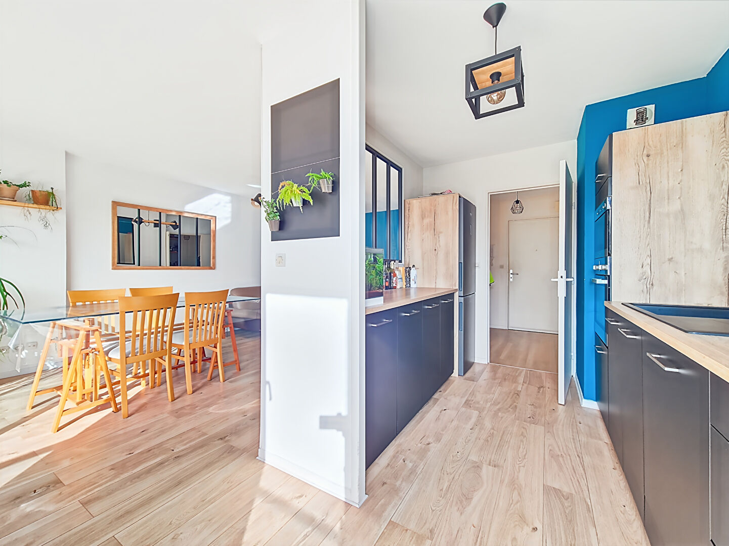 La cuisine indépendante, entièrement rénovée, offre des prestations modernes et actuelles. Elle est fonctionnelle et bien agencée, avec de nombreux rangements.