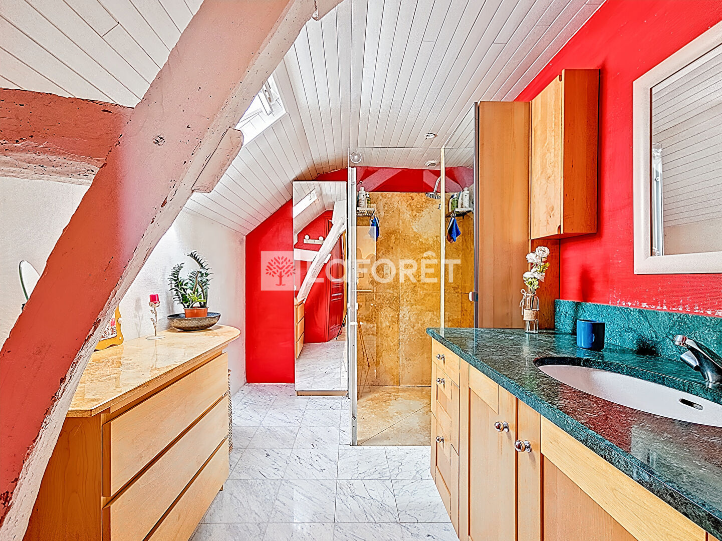 A l'étage trois chambres dont une suite parentale avec sa salle de bains, des WC , une salle d'eau et un grenier offrant un potentiel d'aménagement supplémentaire.