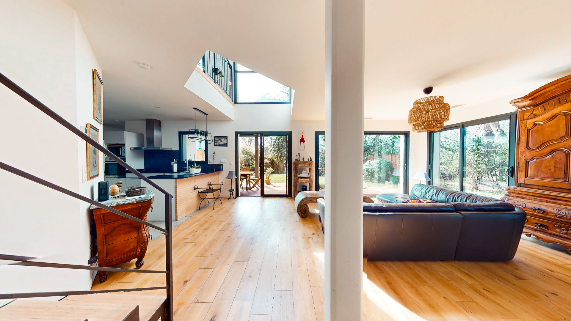 Dès l'entrée, vous découvrirez une superbe pièce de vie lumineuse, sublimée par une belle hauteur sous plafond et de larges baies vitrées qui laissent entrer la lumière tout au long de la journée. Cet espace convivial s'ouvre directement sur un jardin arboré, véritable havre de paix à l'abri des regards.
