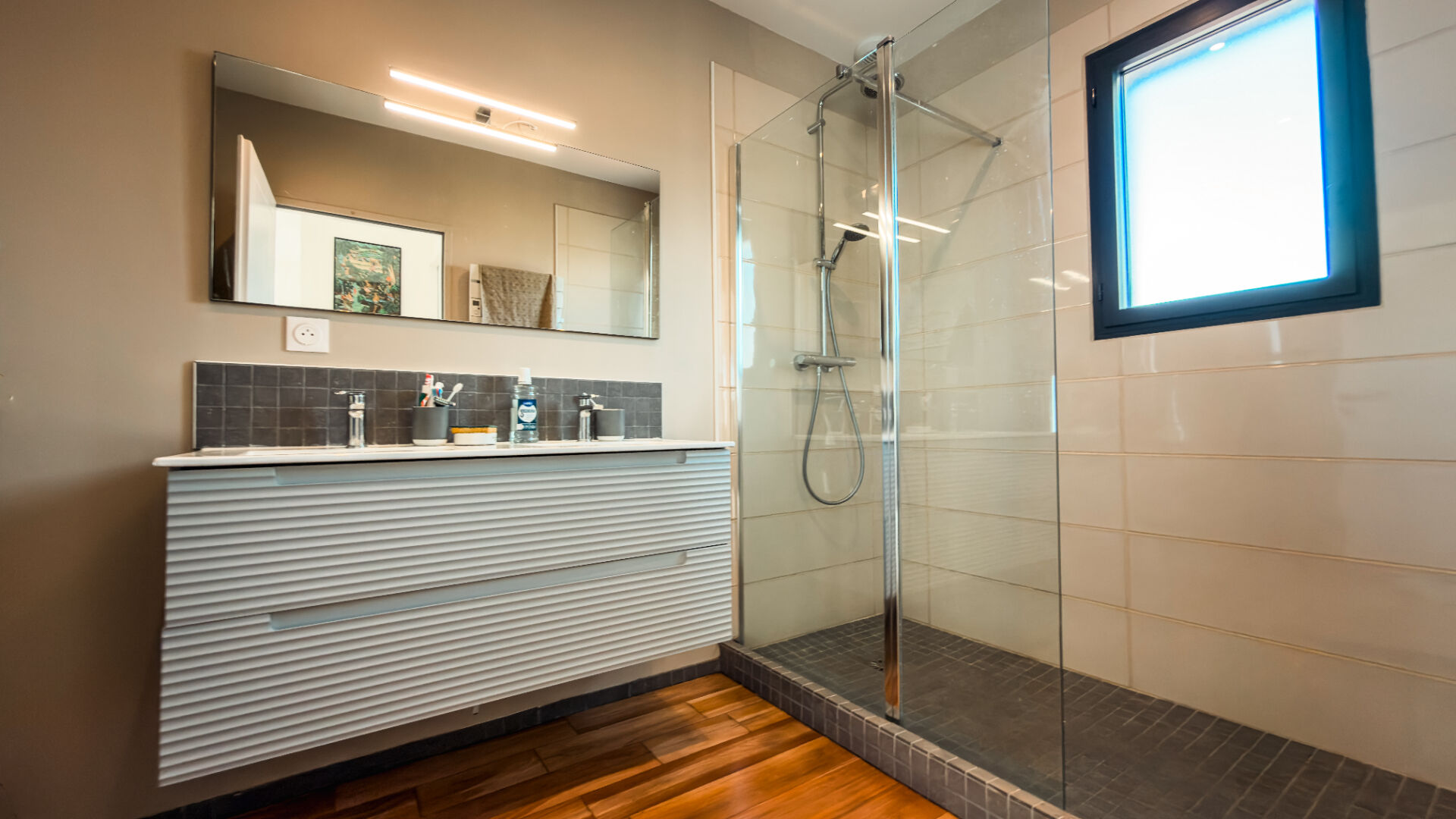 Le rez-de-chaussée accueille également une agréable suite parentale avec sa salle d'eau, idéale pour un confort de vie au quotidien. À l'étage, deux chambres supplémentaires, une salle de bain ainsi qu'une mezzanine viennent compléter l'ensemble : un espace parfait pour installer un bureau, créer un coin lecture ou simplement profiter d'un espace détente.