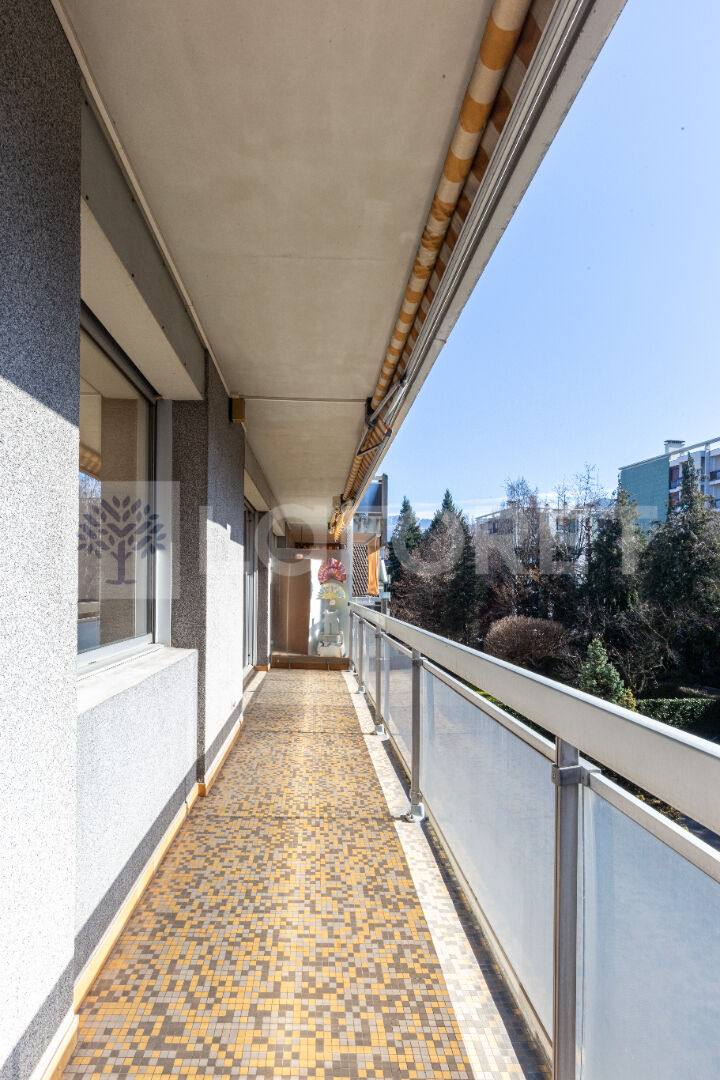 Depuis l'entrée équipée de placards, vous accédez à toutes les pièces de l'appartement. Vous découvrirez une pièce de vie de presque 30 m² avec une loggia, une cuisine indépendante et équipée de 10 m².