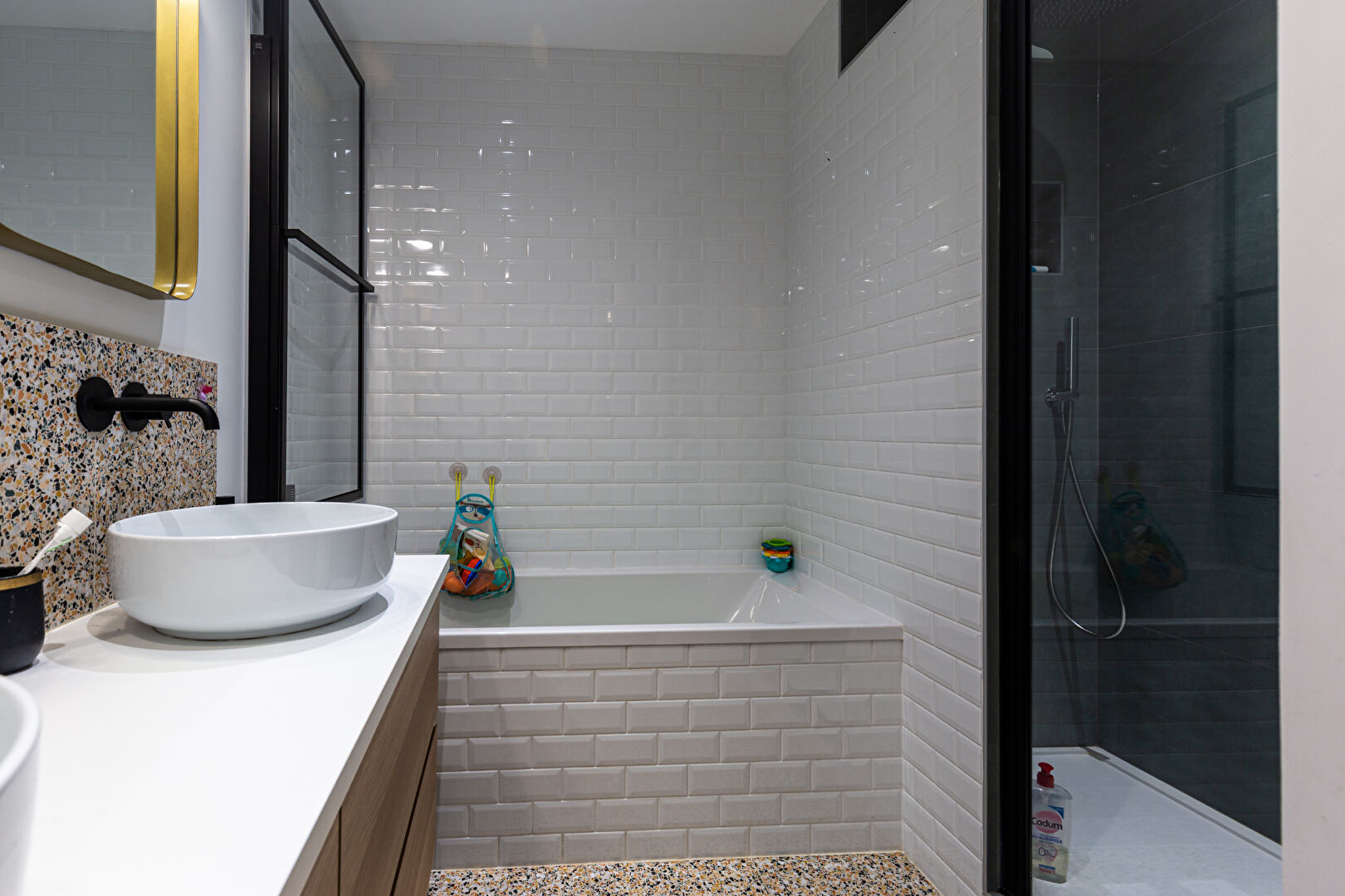 - Une salle de bains haut de gamme comprenant à la fois une baignoire, une douche à l'italienne et une double vasque.