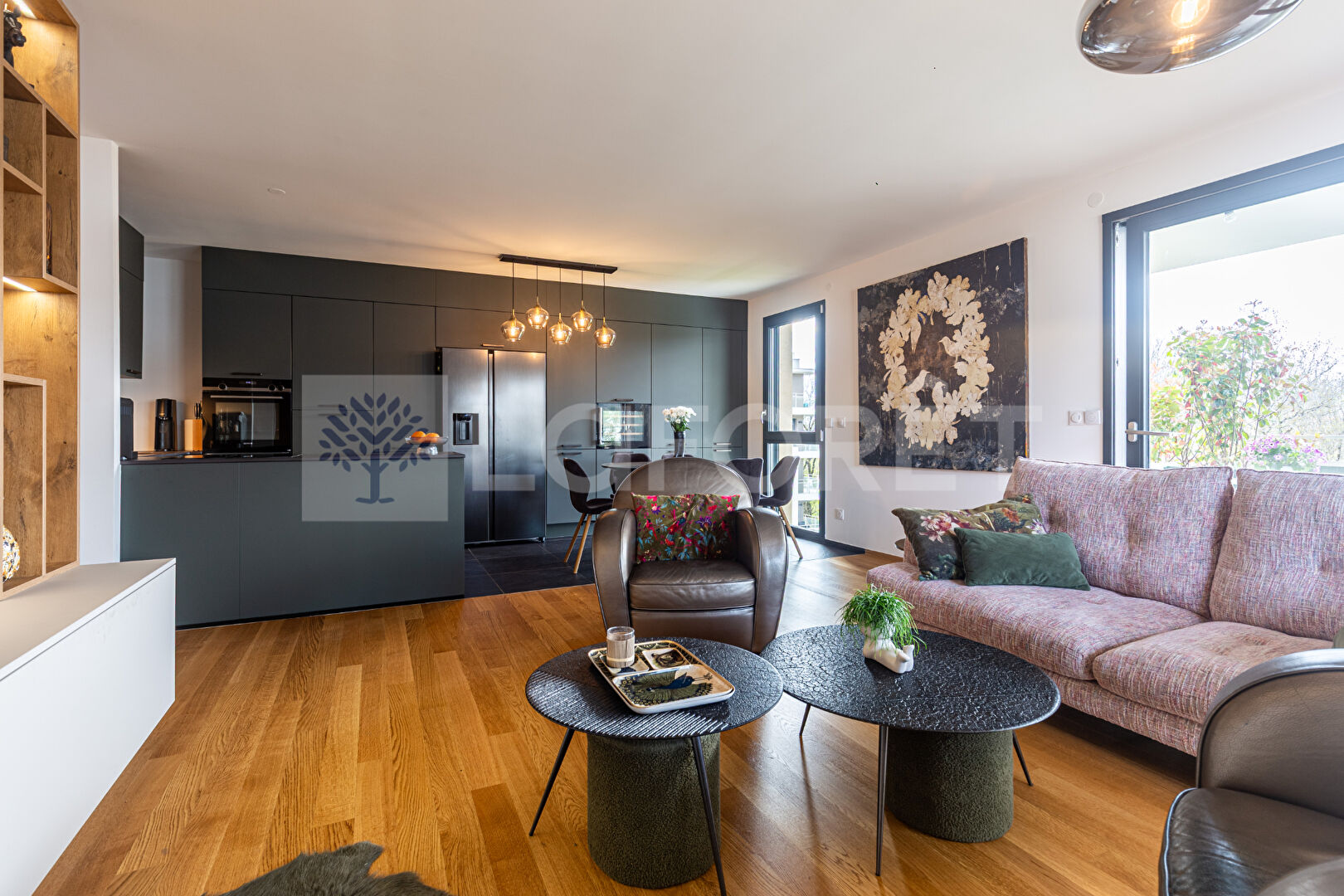 La pièce de vie, dotée d'un élégant parquet et baignée de lumière naturelle, s'ouvre sur une superbe terrasse spacieuse, idéale pour savourer les journées ensoleillées. Le salon/séjour est complété par une cuisine ouverte et équipée avec soin avec de nombreux rangements, un plan de travail en céramique et tout l'électroménager nécessaire. Moderne, fonctionnelle et chaleureuse, elle invite à la convivialité.