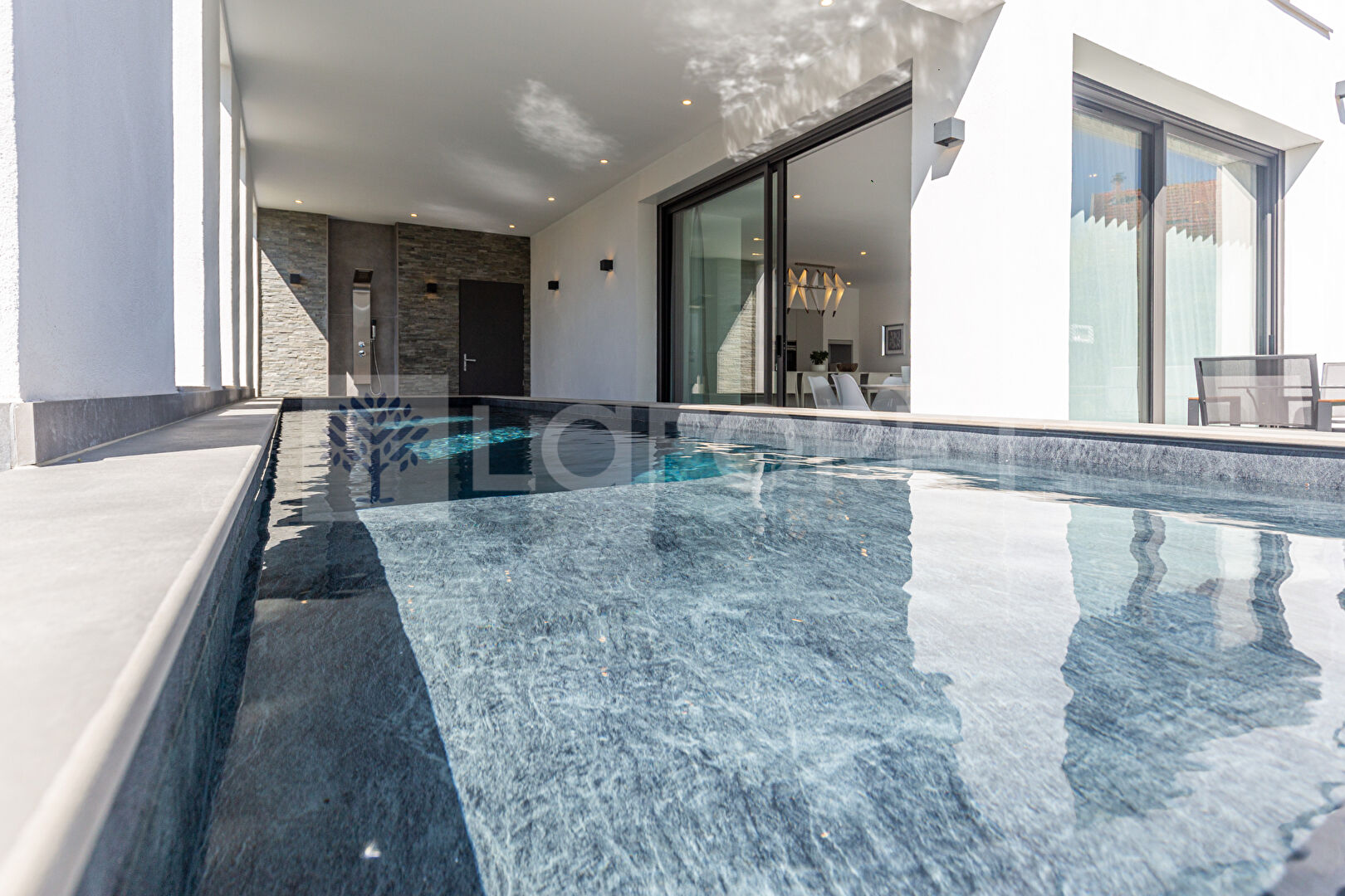 - Un espace piscine semi-couvert, véritable prolongement du salon permettant de profiter de la baignade en toute saison.