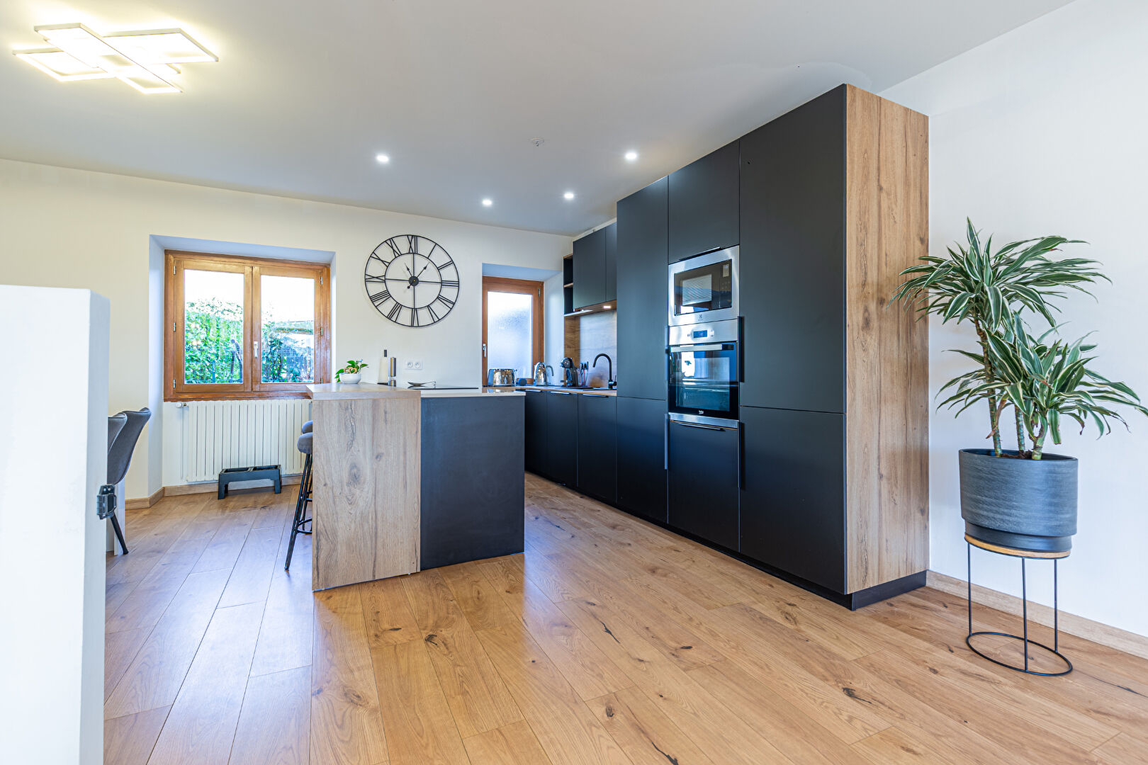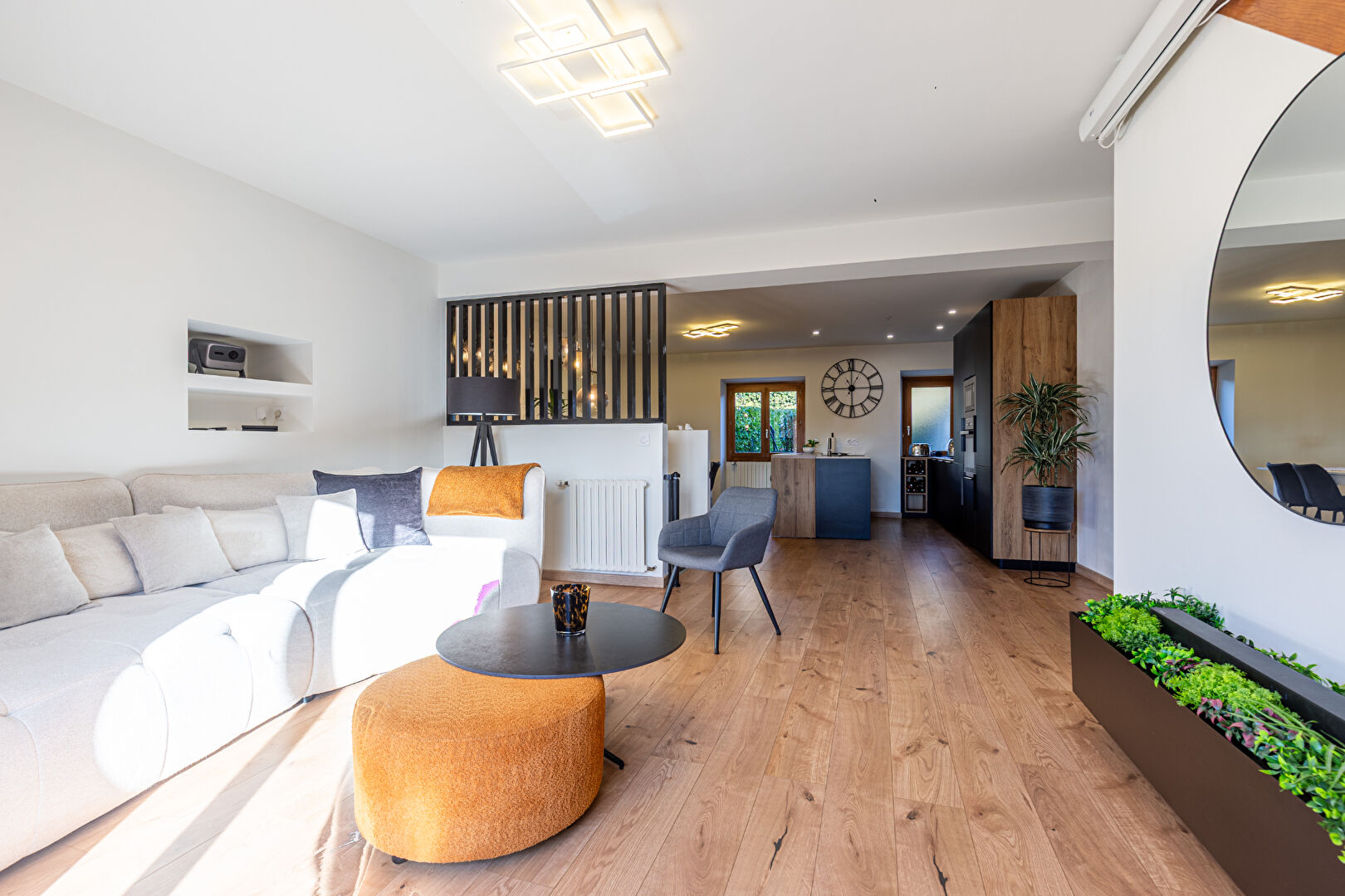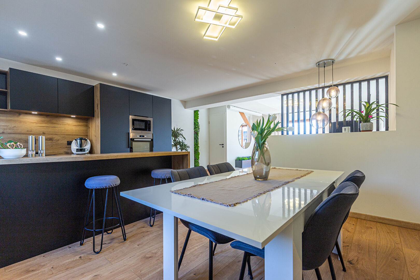 - Espace de vie d'exception (46 m²) : Une vaste pièce de vie baignée de lumière comprenant un salon-séjour convivial et une cuisine moderne de la marque SCHMIDT avec un grand îlot central et un magnifique plan de travail Dekton.