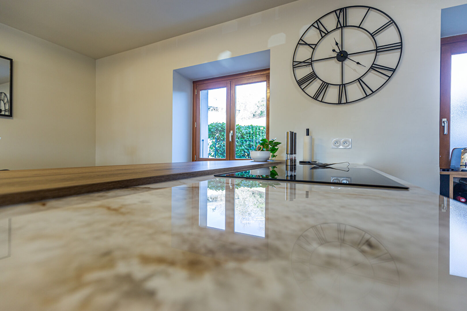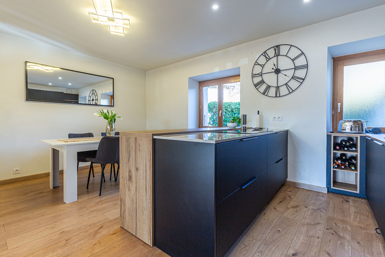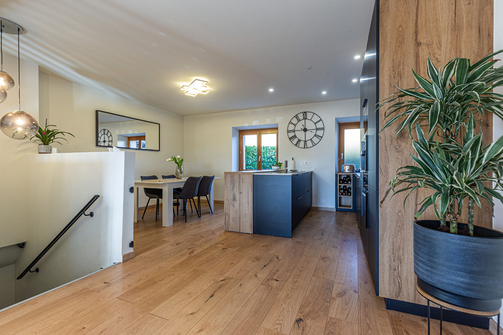 - Espace de vie d'exception (46 m²) : Une vaste pièce de vie baignée de lumière comprenant un salon-séjour convivial et une cuisine moderne de la marque SCHMIDT avec un grand îlot central et un magnifique plan de travail Dekton.