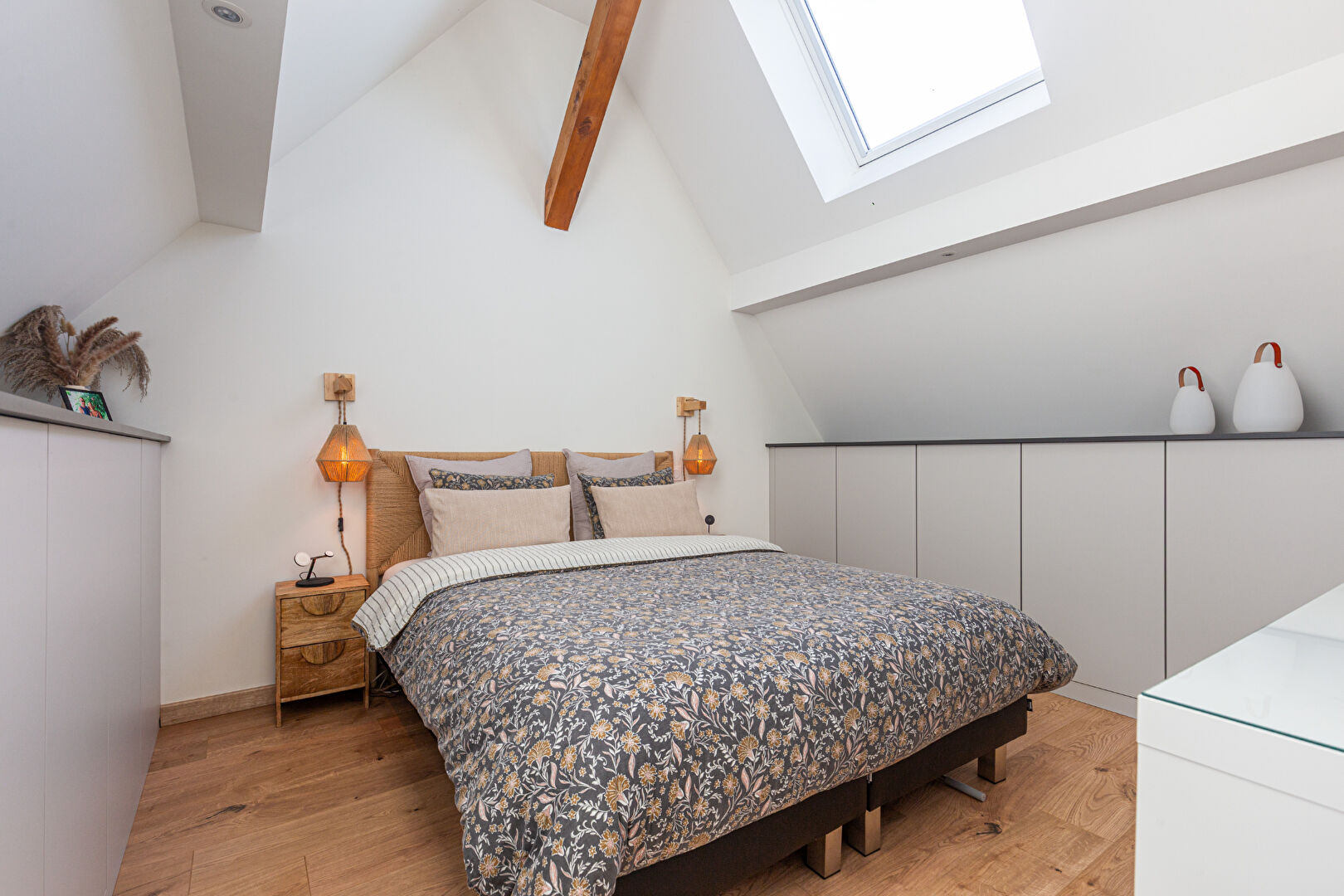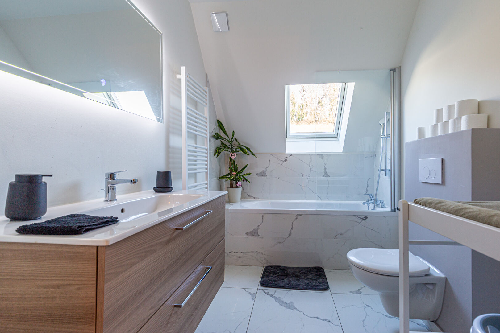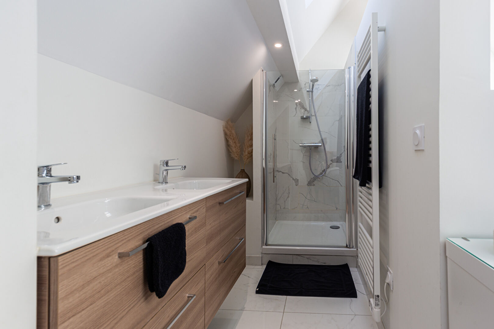 - Espace nuit confortable : Au 1er étage : deux chambres aux dimensions généreuses (17 m² et 14,5 m²) et une salle de bains avec WC. Au dernier étage : Une suite parentale sous combles avec de nombreux rangements intégrés, une salle d'eau privative équipée d'une double vasque.
