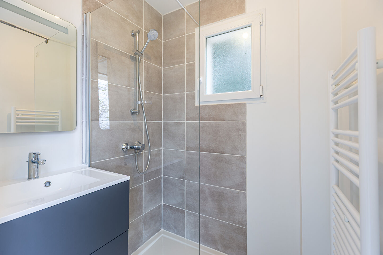 - Une spacieuse salle de bains avec double vasque et WC. Cette salle de bains est équipée d'un velux, offrant une superbe luminosité.