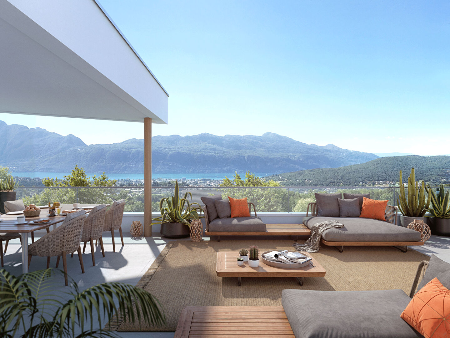 Du type 3 au type 5 tous les logements bénéficient de larges baies vitrées, se prolongeant sur des grandes terrasses permettant d'apprécier ce magnifique panorama sur le Lac du Bourget et les montagnes.