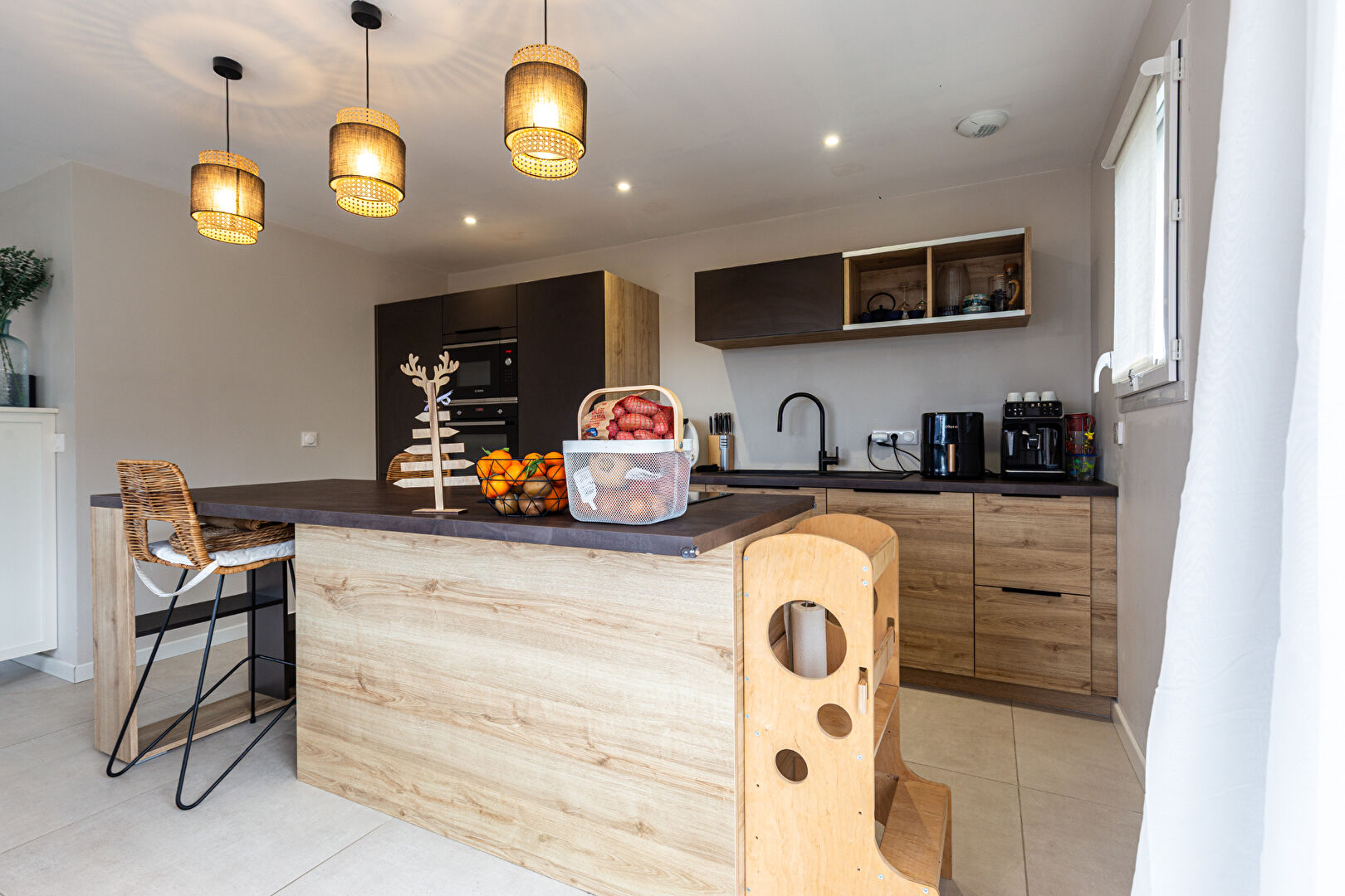- Cuisine ouverte : entièrement équipée avec îlot central, idéale pour la convivialité.