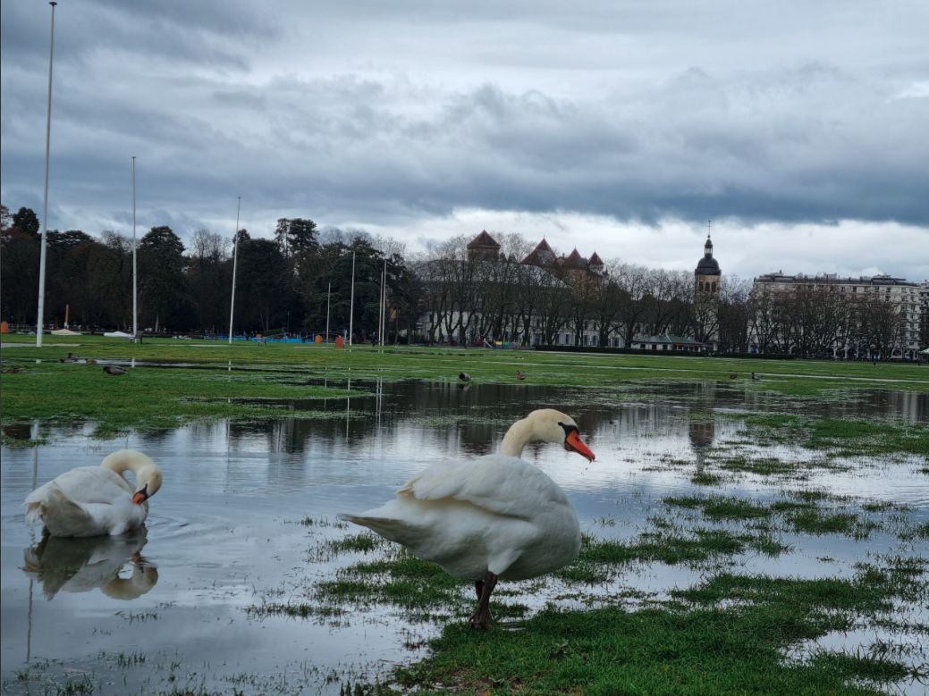 Le Pâquier s’est transformé en grande mare aux canards, faisant le bonheur de la faune locale. Cygnes et canards en profitent. Pour les promeneurs, les bottes sont recommandées.
