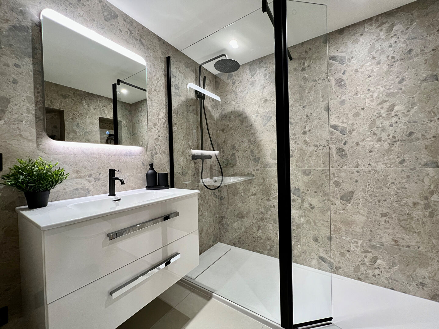 Niché au 7ème et dernier étage, il bénéficie d'une belle luminosité orienté SUD OUEST, d'une vue dégagée et de prestations modernes et haut de gamme. D'une superficie généreuse de 89 m², il se compose d'une pièce de vie de 41 m² avec une cuisine américaine, d'une suite parentale avec sa salle de douche et toilettes, ainsi que de deux chambres prolongées par une terrasse. Une seconde salle de douche avec toilettes complète l'espace nuit.